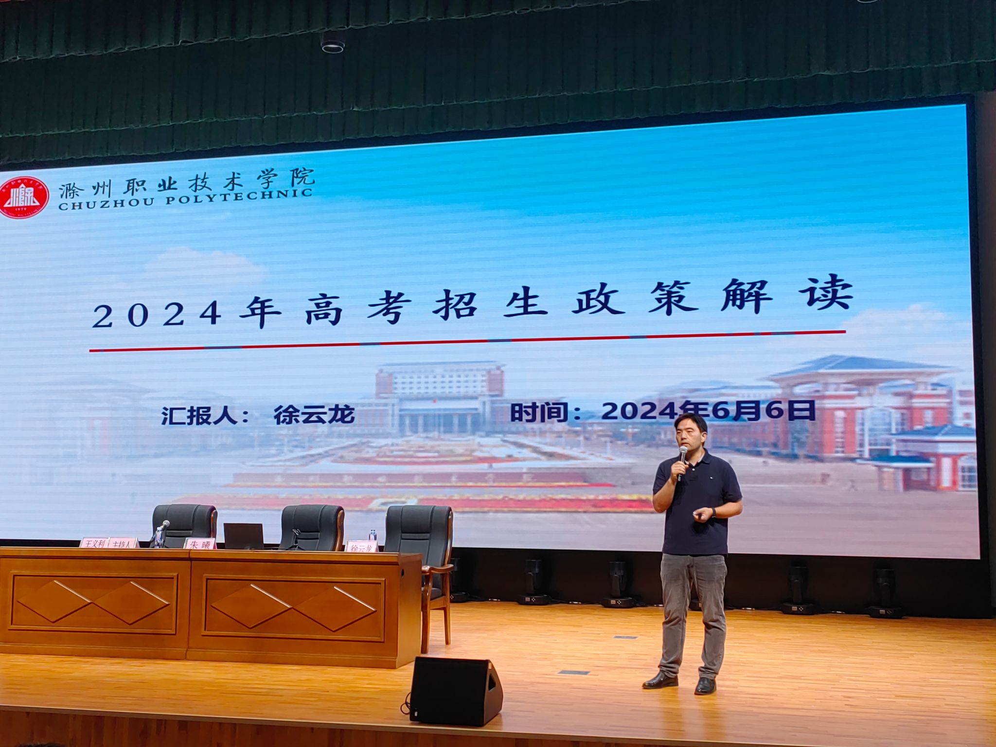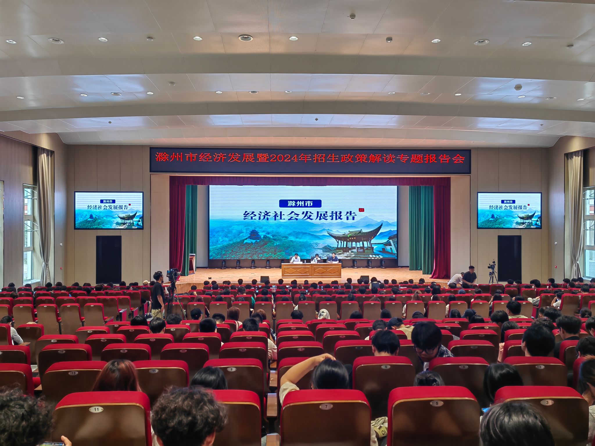 为贯彻落实教育部和省厅有关就业工作会议精神,进一步推动Beat3652024届毕业生就业工作,确保毕业生高质量充分就业,增进毕业生对滁州经济社会发展的了解,吸引更多的毕业生选择滁州、扎根滁州,以及进一步提高Beat365在高考综合改革新形势下的招生宣传工作质量和效果。6月6日下午,Beat365邀请滁州市发展和改革委员会社会发展科科长朱曦及招生就业处副处长徐云龙在6号实训楼报告厅做关于滁州市经济社会发展和2024年招生政策解读专题报告。报告会采用线下会议和线上直播同步进行的方式,各二级学院书记、副书记和2024、2025届辅导员及四百余名学生代表参加现场报告会,线上直播吸引了千余名学生观看。报告会由招生就业处副处长王义利主持。