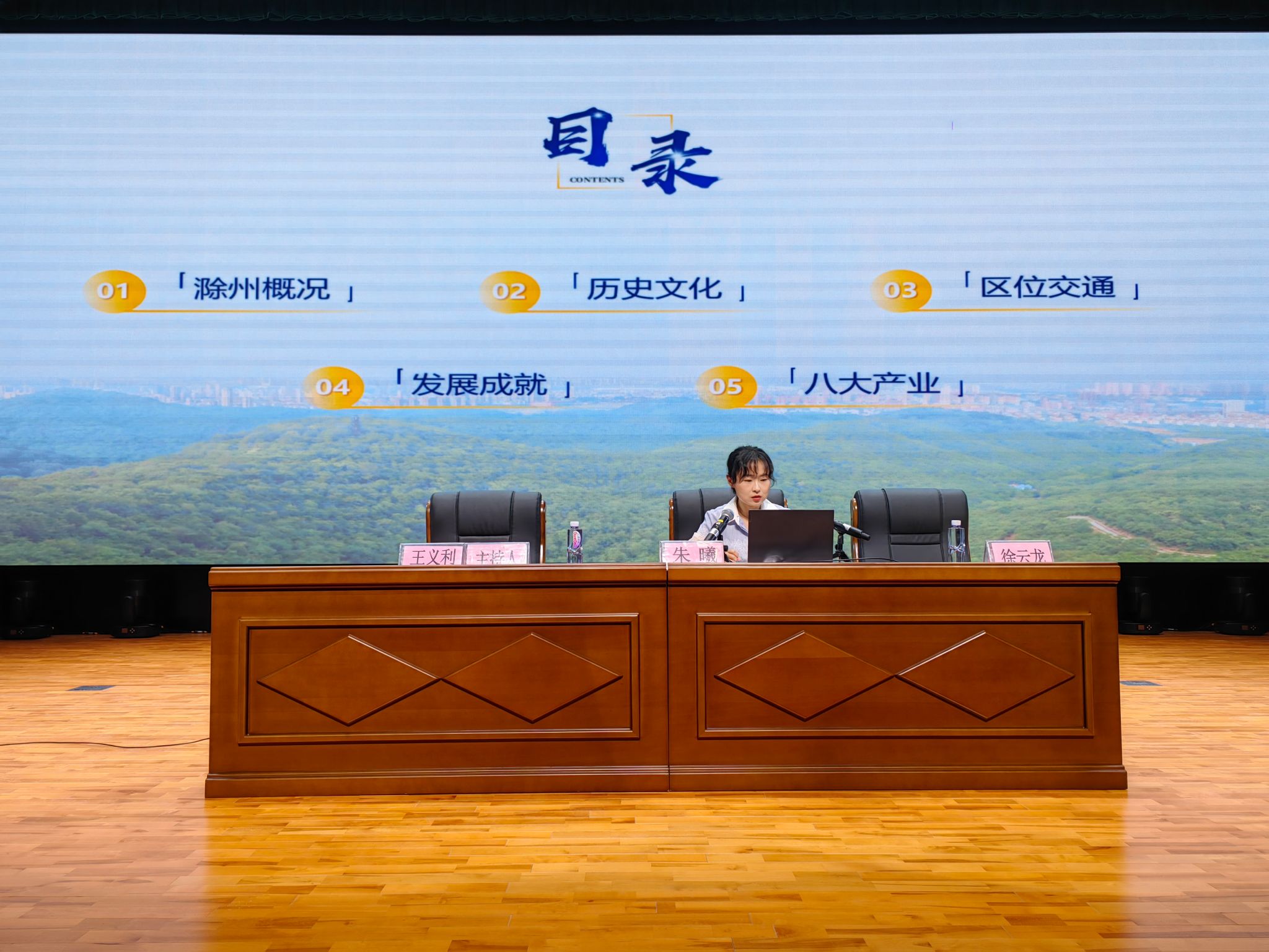 会上,朱曦围绕滁州市概况、历史文化、区位交通、发展成就、八大产业等五个方面向老师和同学们介绍了滁州的历史文化、风土人情,以及滁州近年来在经济、工业、创新、文化、旅游、招才引智、民生等各方面的发展成就,详细介绍了以光伏、新型化工、半导体、汽车及装备制造、绿色食品、智能家电、新能源电池、医药器械为代表的八大产业链及各产业链的重点企业代表。