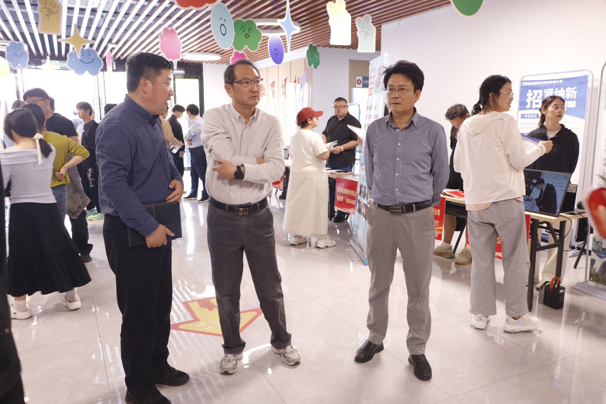 校党委副书记、校长许雪峰,校党委委员、副校长苏有良,招生就业处副处长王义利,南谯区人社局副局长刘立祥等莅临招聘会现场,与来校参加招聘会的企业交流。