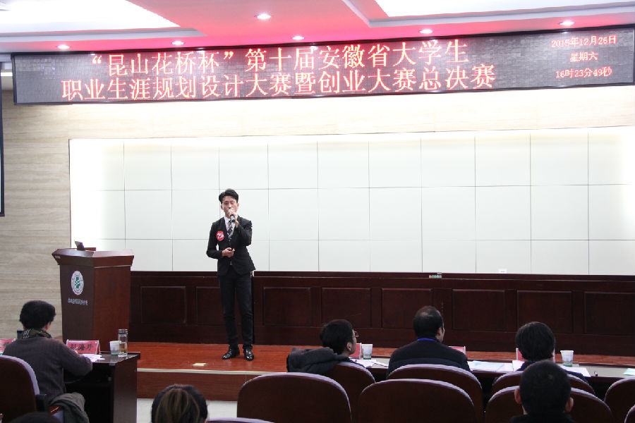 12月26-27日,由安徽省教育厅、安徽省人力资源和社会保障厅、共青团安徽省委联合主办的“昆山花桥杯”第十届安徽省大学生职业规划设计大赛暨大学生创业大赛总决赛在安徽医学高等专科学校隆重举行。省教育厅副厅长杨金龙、省大中专就业指导中心主任鲍勇等领导参加大赛颁奖典礼并讲话。