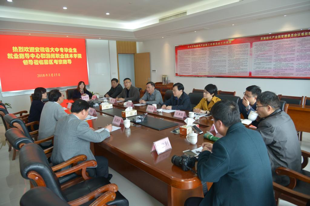3月15日上午,安徽省大中专毕业生就业指导中心主任袁江林和学院党委副书记、院长李柱梁一行对苏滁现代产业园进行了调研。院党委委员、院长助理、招生就业处处长穆松,苏滁现代产业园党工委书记、管委会主任徐保月等同志陪同调研。