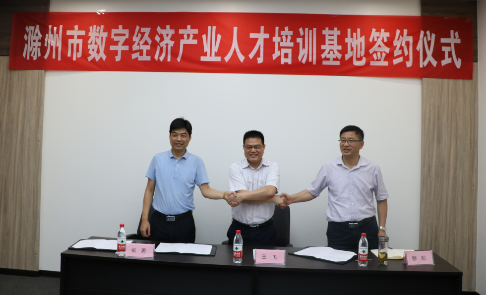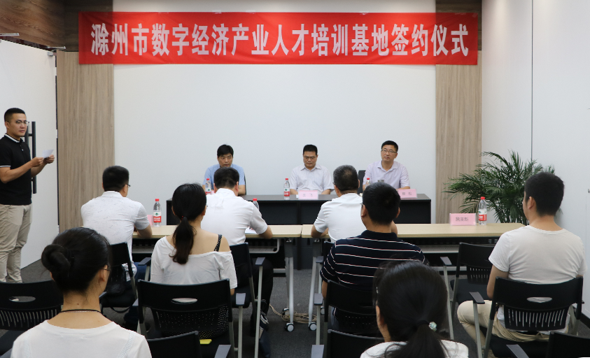 为推进滁州市数字经济发展和培养更多数字经济产业技术技能人才,6月28日上午,“滁州市数字经济产业人才培训基地”签约仪式在滁州市京东数字经济产业园举行。滁州市商务局党组成员、副局长王飞,Beat365党委委员、校长助理、招生就业处处长穆松,安徽京程信息技术发展有限公司董事长张勇出席签约仪式,市商务局、电子商务产业园相关企业负责同志及Beat365有关人员参加签约仪式。