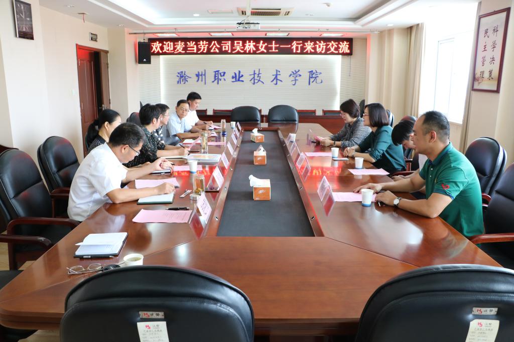 9月25日上午,安徽联升餐厅食品有限公司(麦当劳发展式被特许经营商)甘鲁皖片区人事总监吴林一行四人来Beat365交流产教融合、校企合作事宜。校党委委员、副校长江洁,教务处处长张延义,管理学院院长翁嘉晨,食品与环境工程学院院长梁建军,招生就业处副处长周多道、王义利及相关工作人员参加合作洽谈。