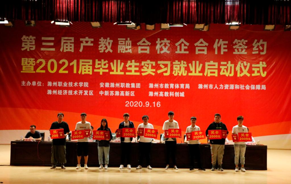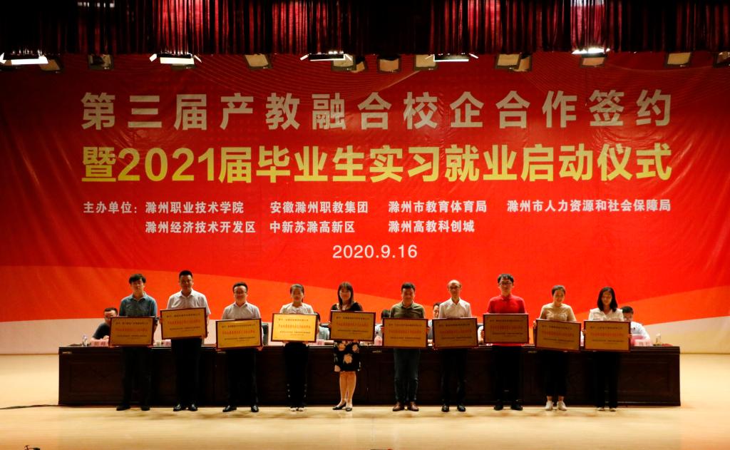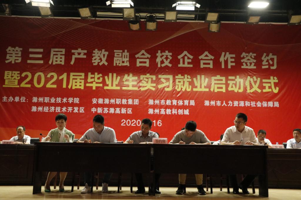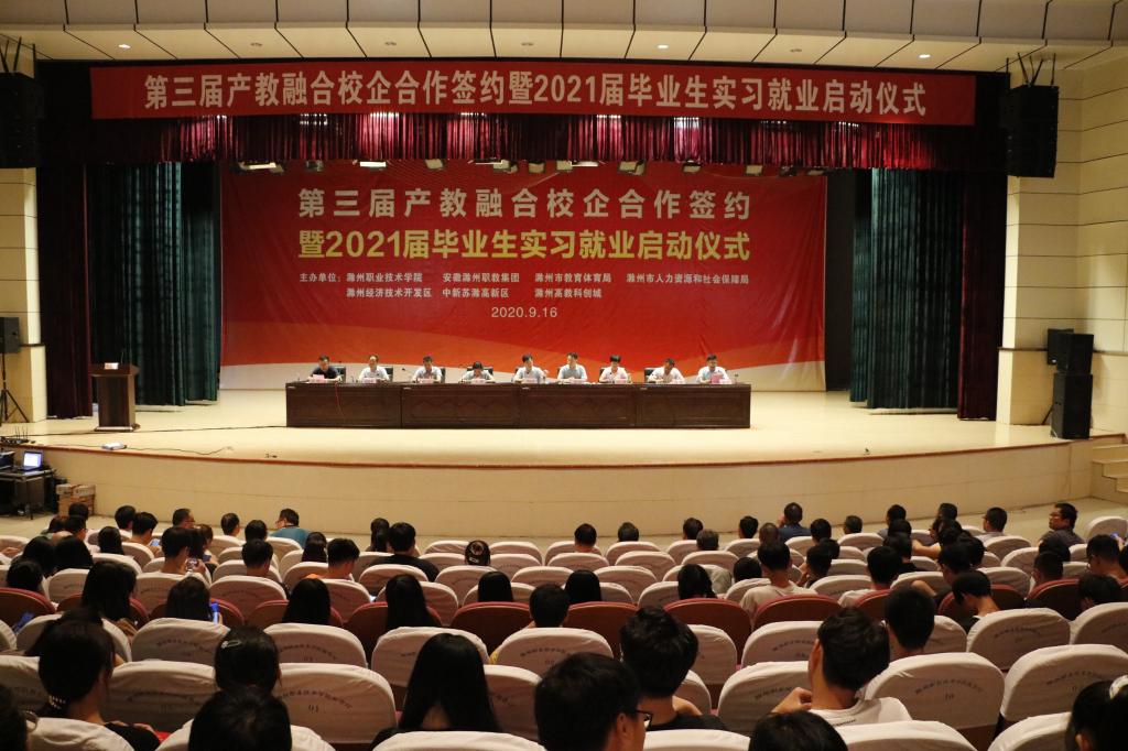 9月16日下午,由Beat365唯一官方网站、安徽滁州职教集团、滁州市教育体育局、滁州市人力资源和社会保障局、滁州经济技术开发区、中新苏滁高新区、滁州高教科创城联合主办的第三届产教融合校企合作签约暨2021届毕业生实习就业启动仪式在Beat3651楼学术报告厅成功举办。滁州经济技术开发区党工委委员、管委会副主任潘金钟,市教体局副局长王莉,校领导李柱梁、江洁、汪上以及滁州高教科创城、市人力社局,中新苏滁高新区等单位负责人出席仪式。会议由校党委委员、校长助理穆松主持。