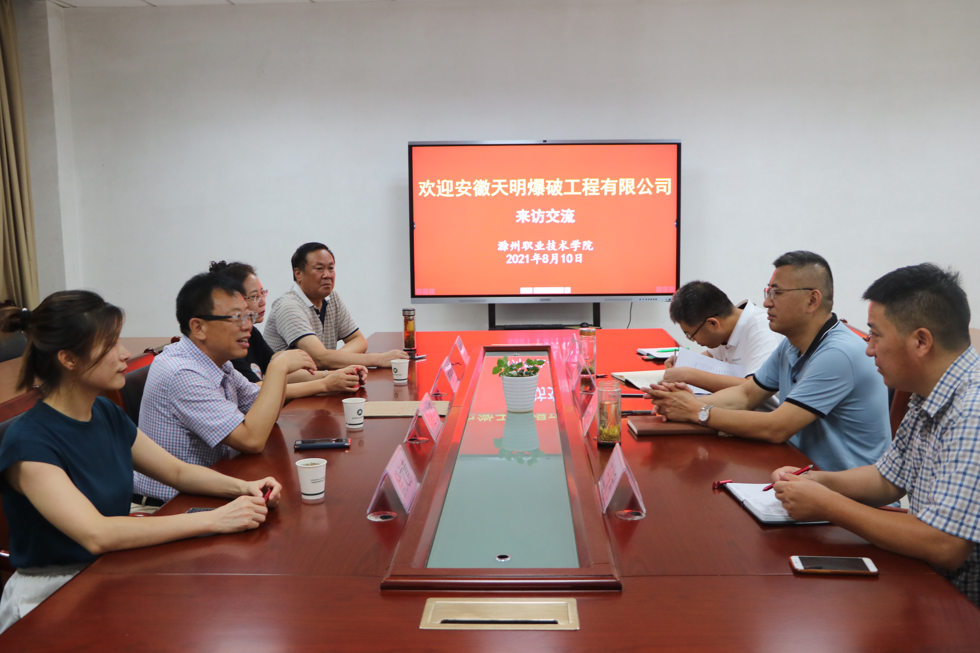 8月10日下午,安徽天明爆破工程有限公司董事长郑德明一行来Beat365洽谈校企合作事宜。校党委委员、校长助理、招生就业处处长穆松热情接待,招生就业处相关负责人参加座谈。