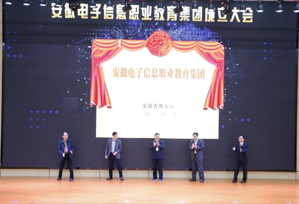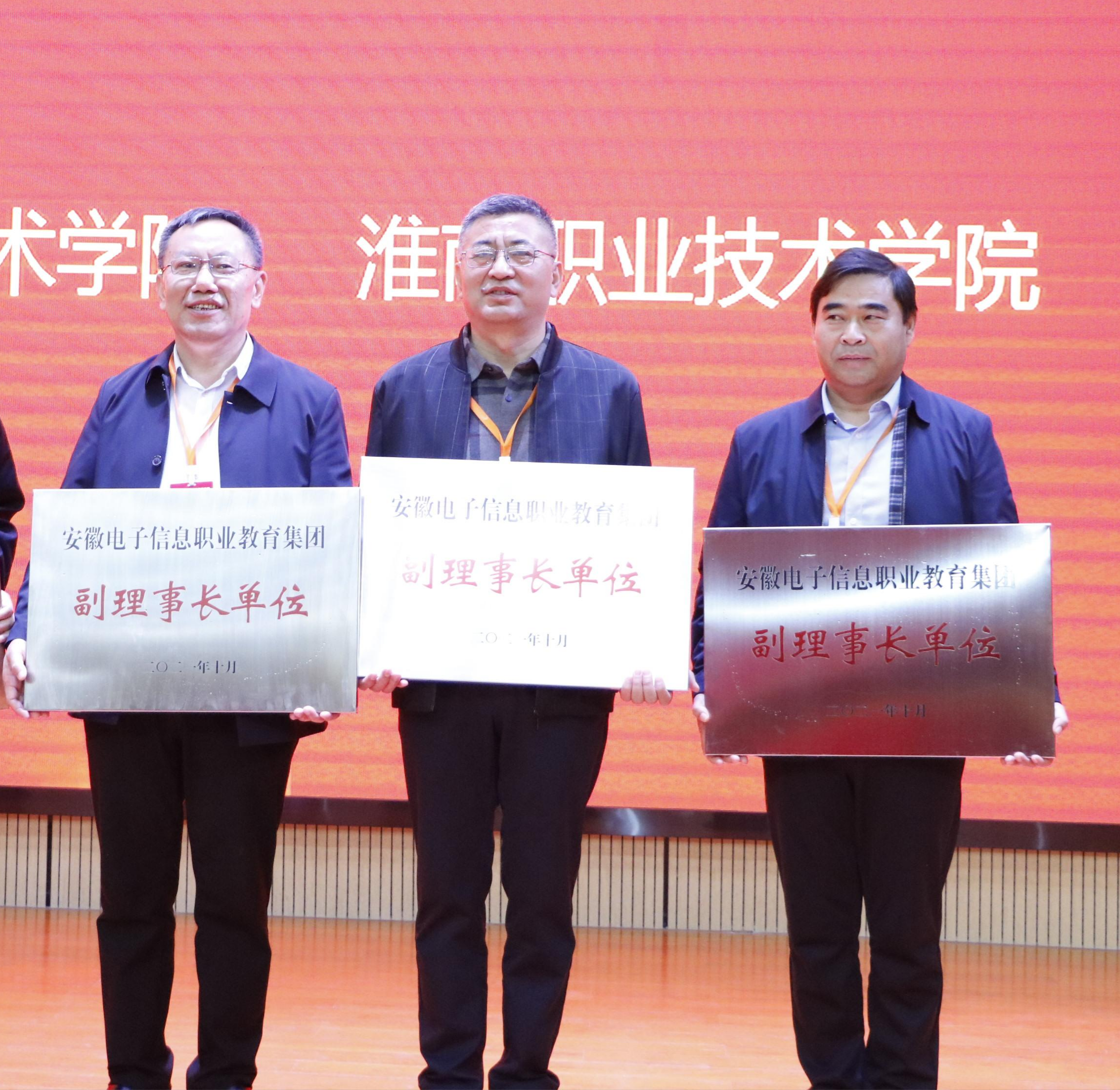 会上,朱国苗宣读了安徽省教育厅关于同意成立安徽电子信息职业教育集团的批复,并与杨明、张卿、李兴旺、石象斌共同为职教集团揭牌,为理事长单位、副理事长单位、理事单位授牌。