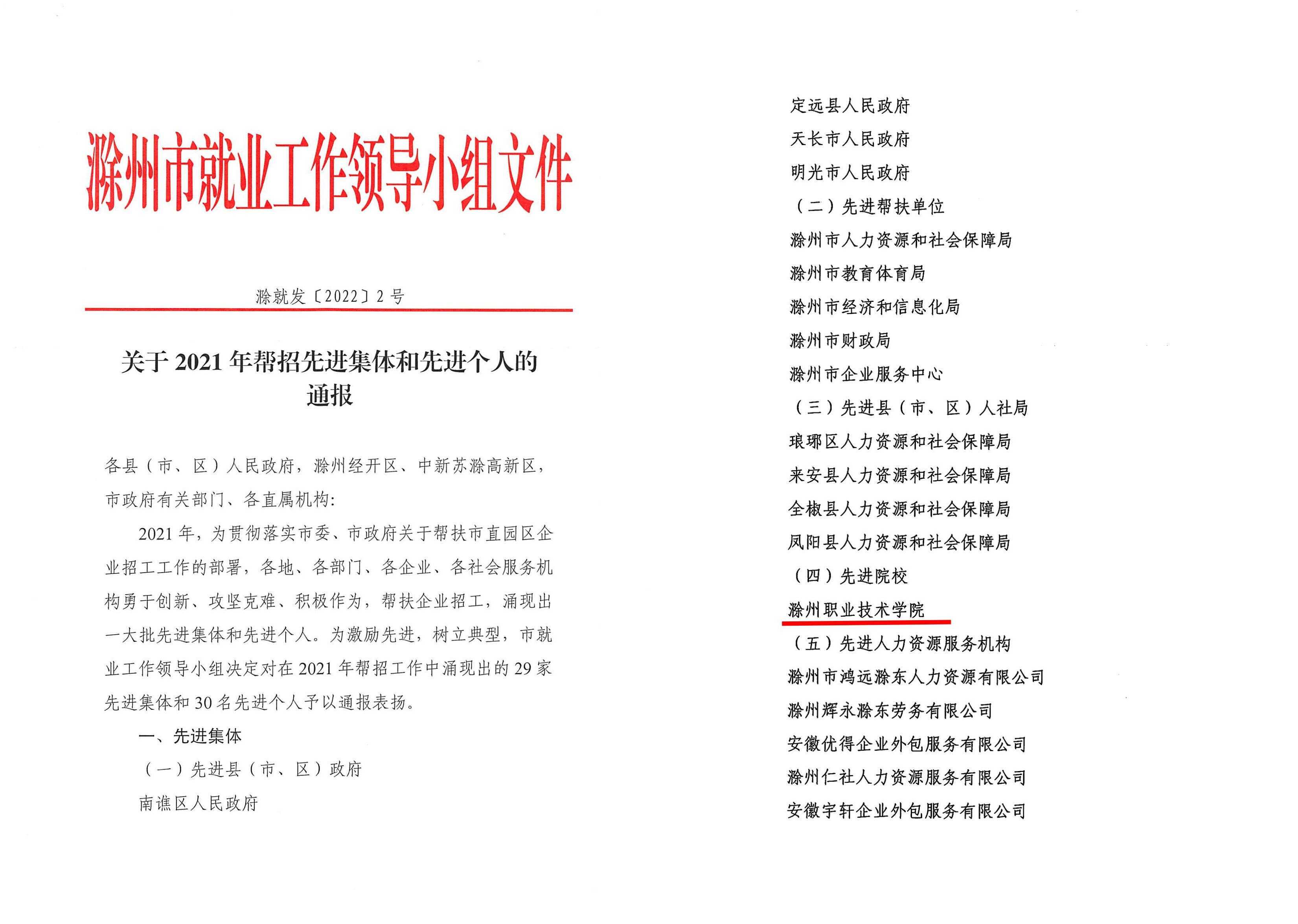 近日,滁州市就业工作领导小组《关于2021年帮招先进集体和先进个人的通报》(滁就发〔2022〕2号),Beat365荣获2021年帮招工作先进集体荣誉称号。
