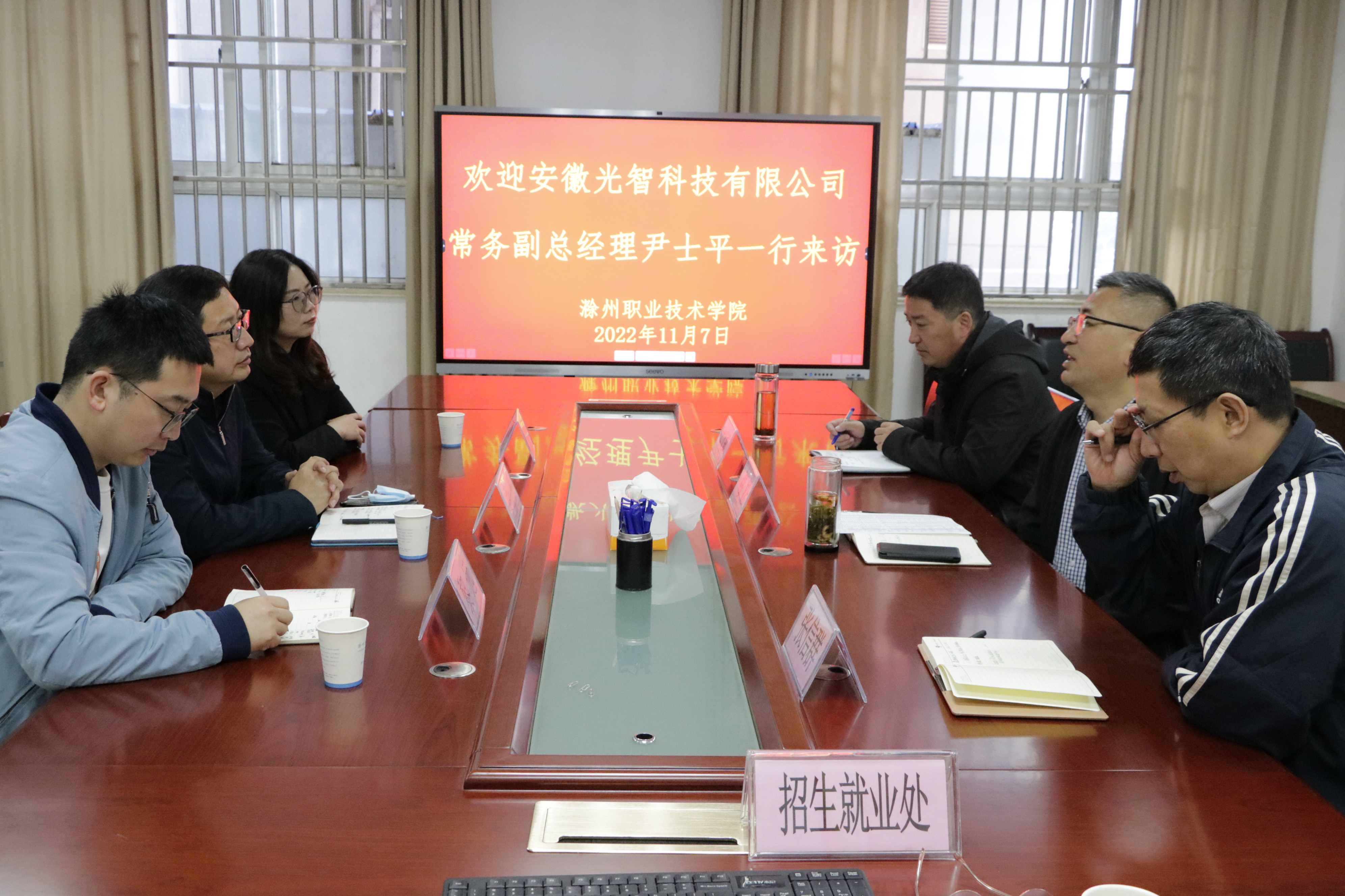 11月7日上午,安徽光智科技有限公司常务副经理尹士平,人力资源总监屈纪填,招聘经理黎远一行来校洽谈校企合作等事宜。Beat365校长助理、招生就业处处长穆松,机械与汽车工程学院院长张信群,招生就业处副处长王义利等相关人员参加会议。