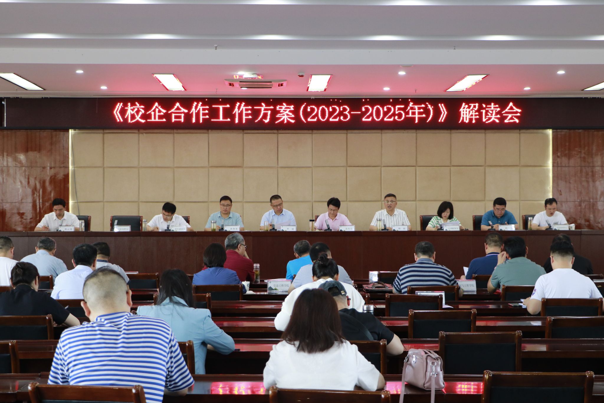 6月9日上午,学校在综合楼5楼报告厅召开了《校企合作工作方案(2023-2025年)》解读会,校党委委员、副校长苏有良,党委委员、组织人事处处长李超,校长助理、招生就业处处长、安徽滁州职业教育集团秘书长穆松出席会议,各二级学院党政负责人正副职、全体系(教研室)主任和专业负责人及教务处、计划财务处、招生就业处、科技处、实验实训中心、信息技术中心等有关部门的主要负责同志参加了会议。会议由穆松同志主持。