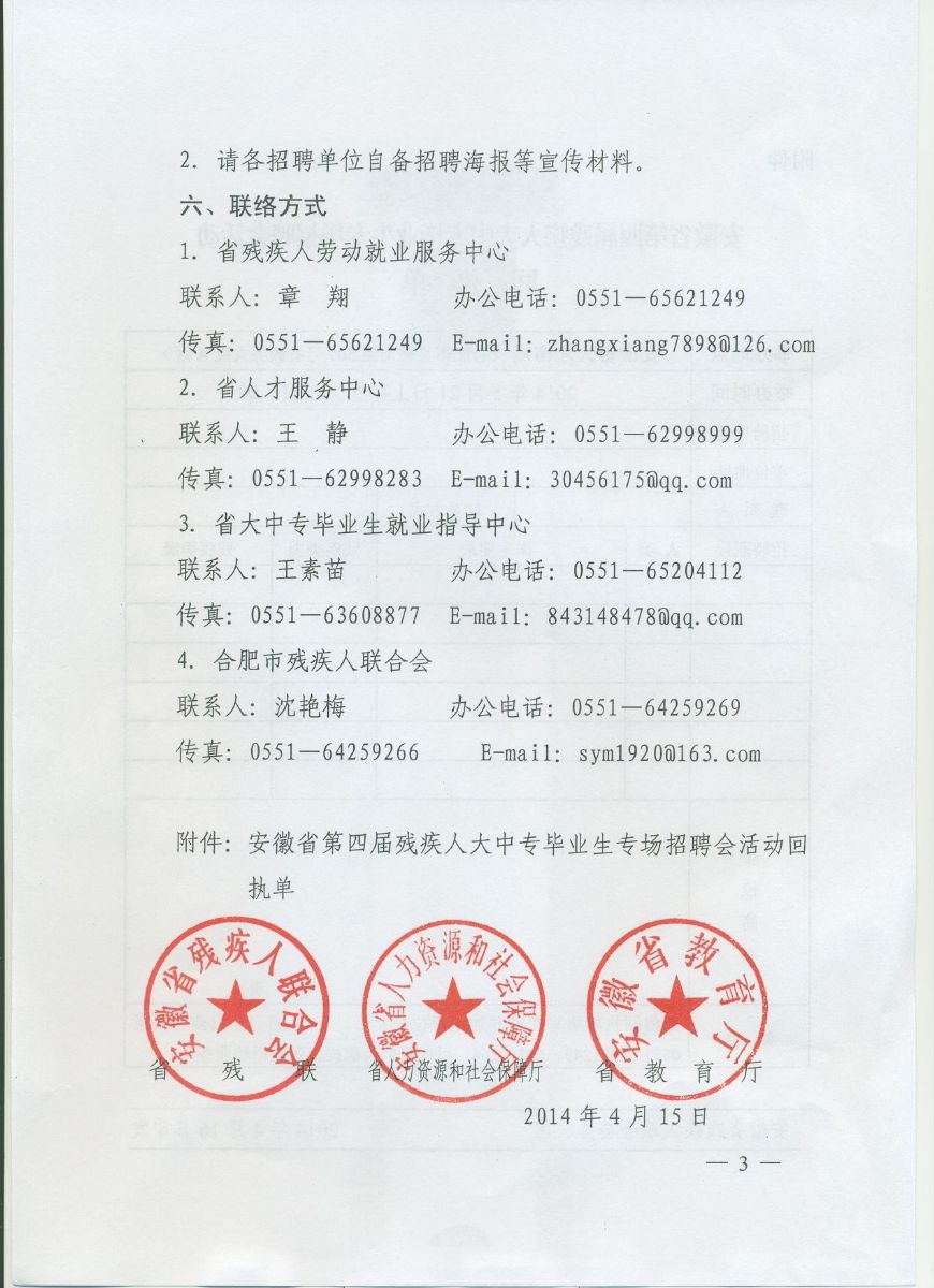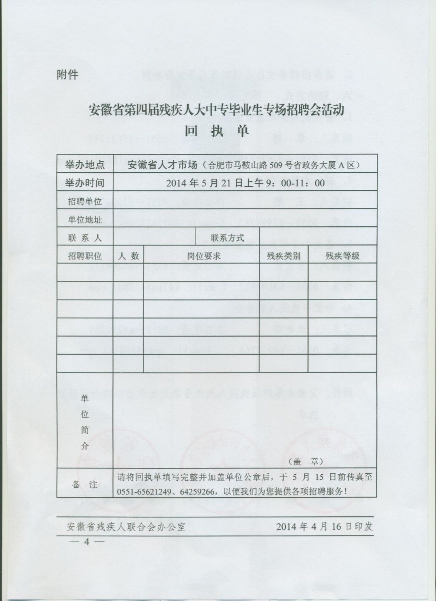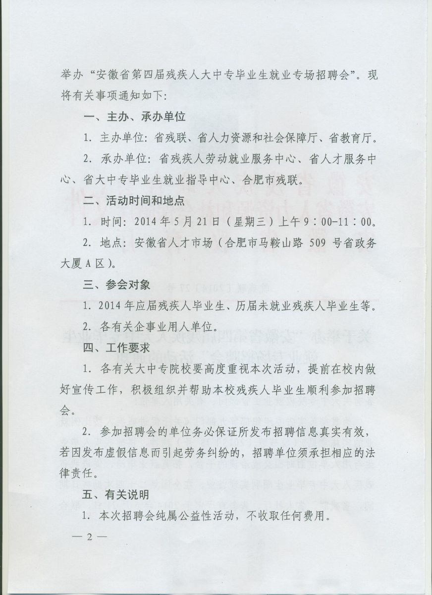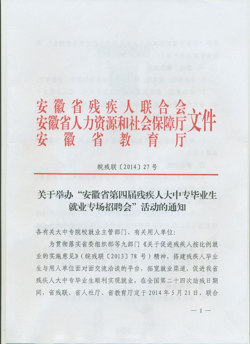 关于举办“安徽省第四届残疾人大中专毕业生就业专场招聘会”活动的通知