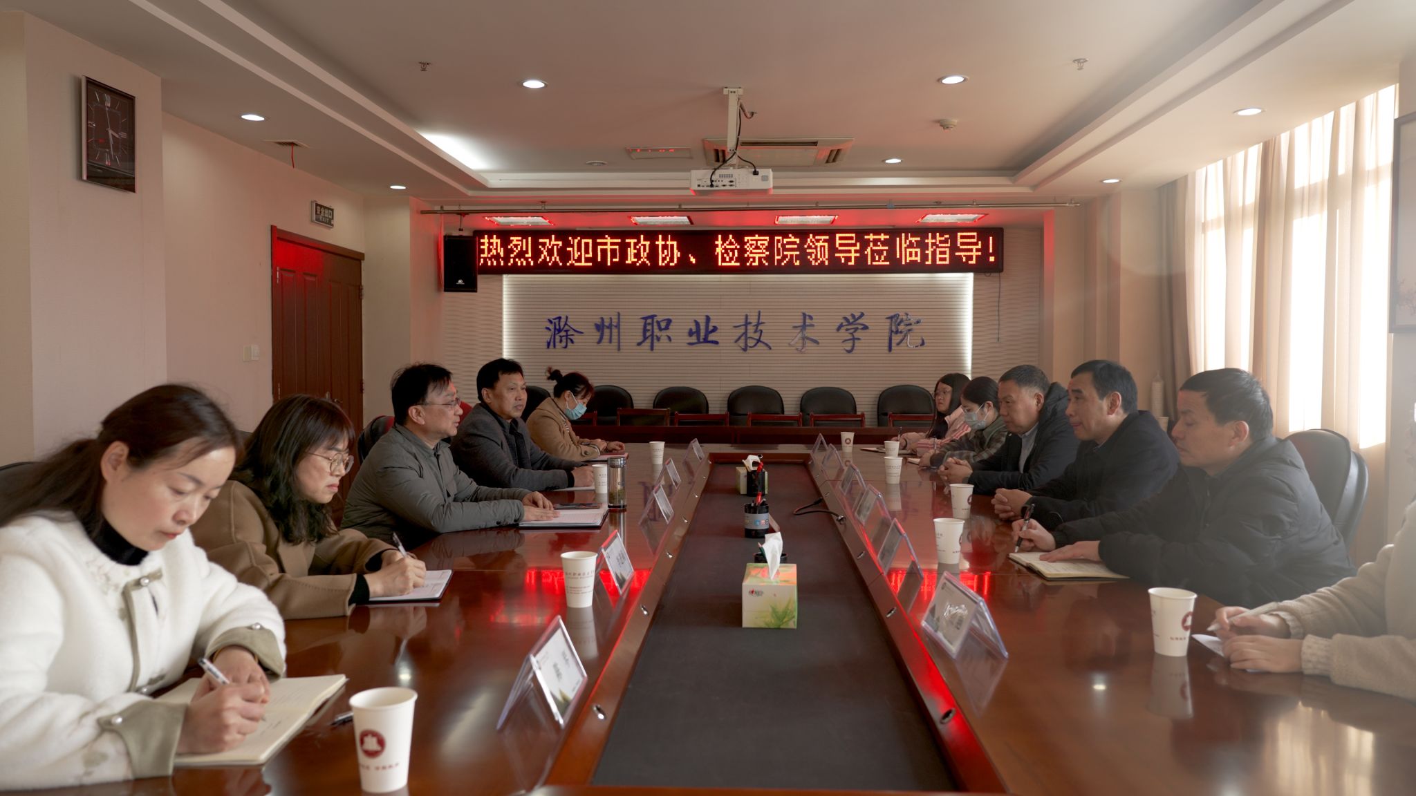 为深入贯彻落实党的二十大精神和习近平法治思想,以及关于“大思政课”的建设要求,做好“为群众办实事”,12月7日,市政协副主席、市检察院副检察长高潮、市政协社法委主任朱宏兵、市检察院第七检察部主任王昌杰等前来Beat365唯一官方网站调研考察,校宣传统战部部长王冬、马克思主义学院院长孔金、市知联会理事李进梅热情接待。