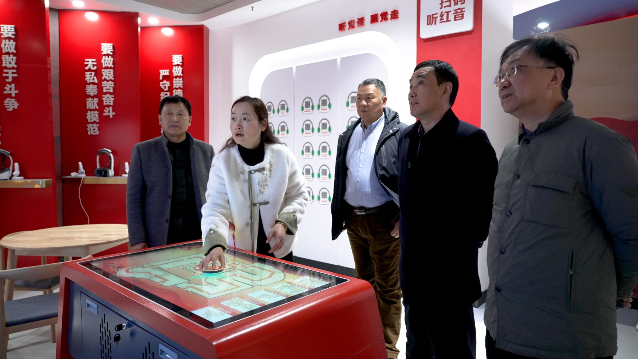 高潮一行首先来到马克思主义学院“大思政课”数字研学中心,马克思主义学院党总支副书记陈琴就专题展厅、互动体验区和交流分享教室进行了简要介绍。