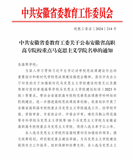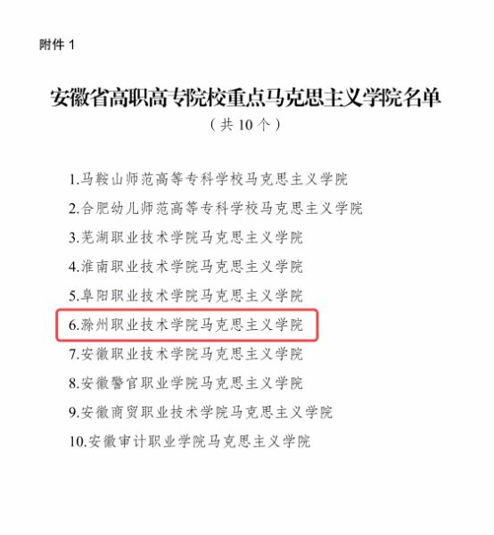 近日,中共安徽省委教育工作委员会下发《中共安徽省委教育工委关于公布安徽省高职高专院校重点马克思主义学院名单的通知》,Beat365马克思主义学院入选安徽省高职高专院校重点马克思主义学院。