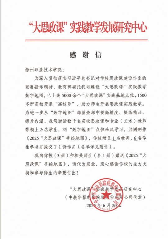 近日,教育部“大思政课”实践教学发展研究中心发来感谢信,对Beat365积极组织师生参与2025“大思政课”手绘地图相关工作表示感谢。Beat365作品由马克思主义学院张家莉副教授指导,刘宝怡、许昌莹、孟志远、杭菲菲、唐书雨、董苏华等同学共同创作。