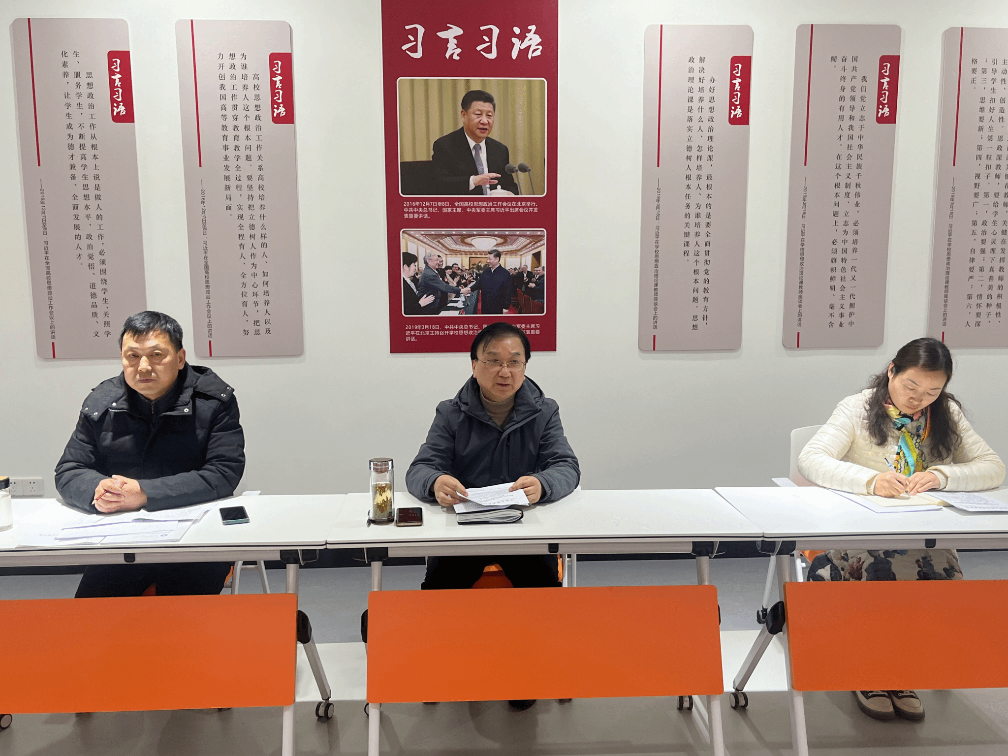 为深入学习贯彻习近平新时代中国特色社会主义思想和党的二十大精神,高标准推动Beat365思政课教师师德师风建设,2024年1月3日,马克思主义学院在“大思政课”数字研学中心组织全体思政课教师学习《新时代高校思想政治理论课教师行为规范和准则》。校党委委员、宣传统战部部长王冬参加会议并作指导讲话,会议由马克思主义学院党总支书记、院长孔金主持。