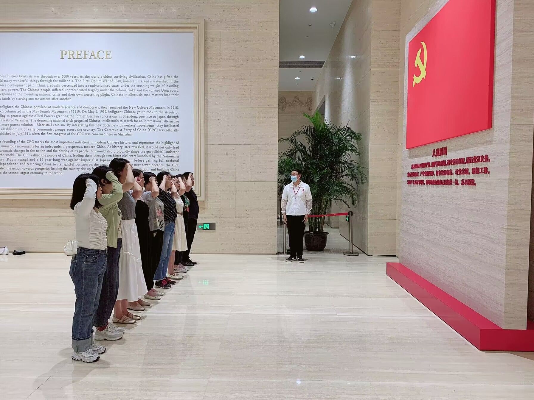 中共一大会址是我们党的诞生地,也是中国共产党人的精神家园。在这里,我们寻见初心,深刻感悟中国共产党人历久弥坚的初心和使命,从中汲取信仰的力量。中共一大纪念馆展厅以“初心使命”贯穿全篇,共分为序厅、“前仆后继、救亡图存”“民众觉醒、主义抉择”“早期组织、星火初燃”“开天辟地、日出东方”“砥砺前行、光辉历程”和尾厅7个板块,综合采用多种展示手段,全面系统地展示了中国共产党的诞生历程。党员同志们跟随讲解员认真聆听了内容讲解,观看了实景+裸眼3D展示的“开天辟地大事变”,回顾了中共一大的曲折过程,深刻了解了中国共产党从建立之初到发展成熟的革命历程,铭记党的奋斗历史,重温建党精神。支部党员同志在胡颖颖同志的带领下重温了入党誓词:“我志愿加入中国共产党,拥护党的纲领,遵守党的章程……”,在鲜红的党旗下,各位党员同志高举右手庄严宣誓,党员的责任、使命、荣耀在此刻从心底油然而生。