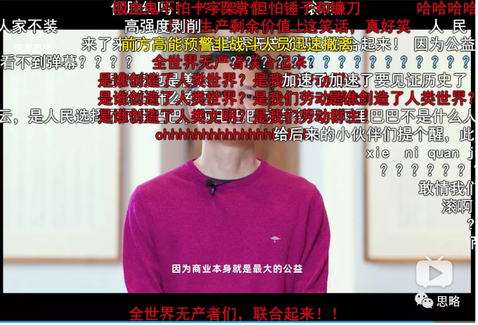 还有一条内容是这样的:他们不只是资本家,他们还要给自己立一个无产阶级的牌坊,对外他是人民富豪,对内他要向社会输出“人才”。一边搞你还得一边让你夸着,美化自己行为,强调正当性,要让人们“快乐”地感受剥削,人们回过神来,才着了味道。很多年轻人并不是彻底的不分历史阶段的否定资本,他们特别反感资本的“又当又立”。而资本大鳄们对此还浑然不觉,继续把资本和公益挂钩,以为这样就能让年轻人忘记资本的本性。这次年轻人连带着对“资本为什么要做公益”,也进行了有力的揭露,弹幕里那句“公益是最好的生意”,已经道破资本公益的本质。之前很多人都看不透的资本积极做公益的动机,但在B站这些年轻人眼里,资本的这点猫腻就像遇到了X射线,比裸奔都更透明。对于一些嗜血的资本来说,慈善的本质是什么?我记得壹基金前秘书长杨鹏说过一句话至为深刻:资本搞慈善的目的是要“清洗企业家脸上的脓和血”。这是杨鹏在他即将担任秘书长的阿拉善SEE基金会第一次发起筹备会议上的发言内容,可以说一语道破资本家做慈善的玄机。而这个热衷于做公益的杨鹏是美国垄断资本精英代言人安•兰德的信奉者,安•兰德是彻底地反对慈善的,反对富人以任何形式将自己的利益分给穷人。杨鹏当然也是反对马克思主义的,但他肯定认真读过马克思,马克思就说过:“资本来到世间,从头到脚,每个毛孔都滴着血和肮脏的东西”。很多资本(非指全部)热衷做公益的目的,透过现象,就是这么一句话的事。用马克思的理论分析问题,一下子就能抓住了公益的本质。