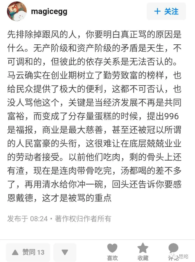 我个人认为,能做 996 是一种巨大的福气,很多公司、很多人想 996 都没有机会。如果你年轻的时候不 996,你什么时候可以 996?你一辈子没有 996,你觉得你就很骄傲了?今天中国 BAT 这些公司能够 996,我认为是我们这些人修来的福报。时代变了,年轻人变了,年轻人不再盲从市场化主流媒体,不再盲目崇拜资本成功人士,不再轻易承认和相信权威。他们也不只是会歌颂自己的祖国,他们还有独立的思考能力、理论思辨能力和批判能力,对于中国社会内部问题的分析,已经深入到资本层面。他们的社会分析和批判力,其实已经超越很多年龄更大的人,比那些至今还在跟着主流迷信西方经济学、嘲笑年轻人“战狼”“小粉红”的那些人,更是不知道高明了多少倍。但一些曾经站在财富巅峰并且也具有话语号召力的资本精英,不一定愿意相信和接受这种变化已经发生、并正在继续发生。前浪不一定服气后浪,自以为能继续给后浪当人生导师的大有人在。抱有这种想法的人,恐怕早晚要被后浪拍在沙滩上。从B站的评论看,年轻人怼马云,还不只是因为马云这次寄语的内容,还有马云在之前的一些言论。这次的寄语只是一个导火线,年轻人批判马云,也不是全盘否定马云本人,甚至也不是针对马云个人,针对的是资本的贪婪本性以及资本喜欢以“人民利益”代表自居的伪善。知乎有一条评论是这么写的:
