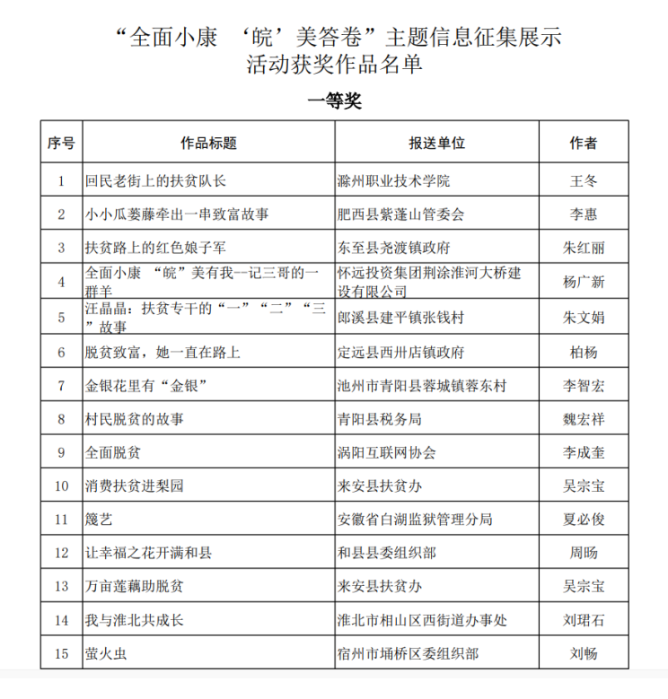 为贯彻落实党的十九届五中全会精神,集中展示全面建成小康社会取得的决定性成就,由省委组织部、省委网信办、团省委联合开展了“全面小康‘皖’美答卷”主题信息征集展示活动,2020年12月启动,活动共征集到文字类,图片类和视频类作品1170件,经过网上展示投票和专家评审两轮筛选,最终评出文字类,图片类和视频类作品特等奖10名,一等奖20名,二等奖60名。