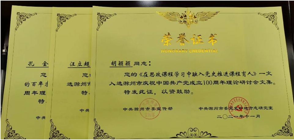 为切实学习贯彻习近平庆祝建党百年“七一”重要讲话精神,及时学习宣传十九届六中全会精神,11月11日,滁州市委宣传部召开了“滁州市庆祝中国共产党成立100周年理论研讨会”,并颁发了荣誉证书。马克思主义学院三名教师孔金、胡颖颖、汪立超以文受邀参加。