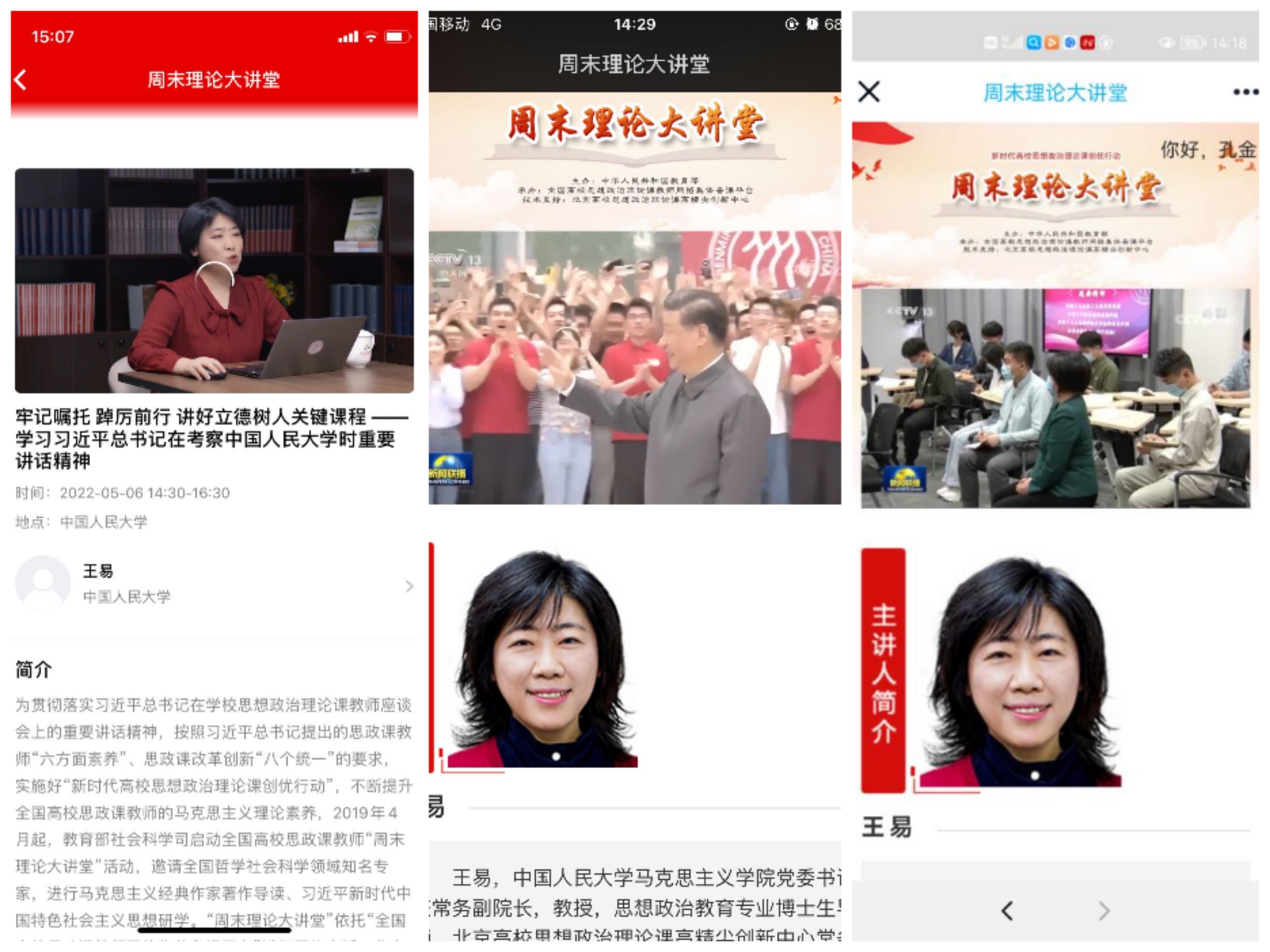 5月6日全国“周末理论大讲堂”邀请中国人民大学王易教授做主讲嘉宾,她与我们分享了习近平总书记走进思政课智慧教室、同青年学生一起认真倾听并参与讨论的现场故事,从思政课教师的视角解读习近平总书记重要讲话精神,并对如何学习贯彻重要讲话精神进行探讨。本次学习活动是教育系统深入学习贯彻习近平总书记在中国人民大学考察时重要讲话精神工作的一项“规定动作”。马克思主义学院组织全体专兼职教师进行线上学习。