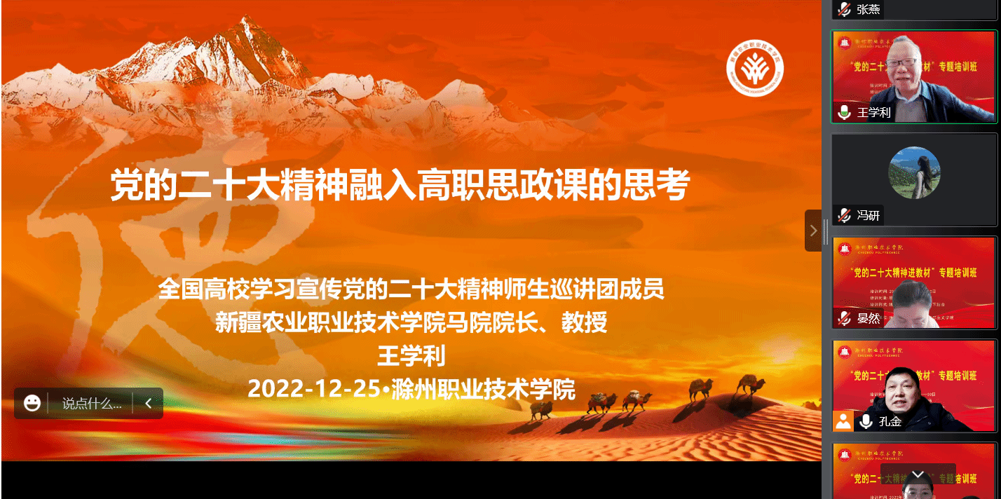 根据安徽省教材委员会办公室转发国家教材委员会办公室关于做好党的二十大精神进教材工作的通知要求,现举办Beat365唯一官方网站习近平新时代中国特色社会主义思想和党的二十大精神进教材专题培训班。12月25日,新疆农业职业技术学院马克思主义学院院长、教授王学利受邀做第一场专题辅导党的二十大精神融入高职思政课的思考》,线上会议由马克思主义学院副院长孔金主持,全体专兼职思政教师参加。