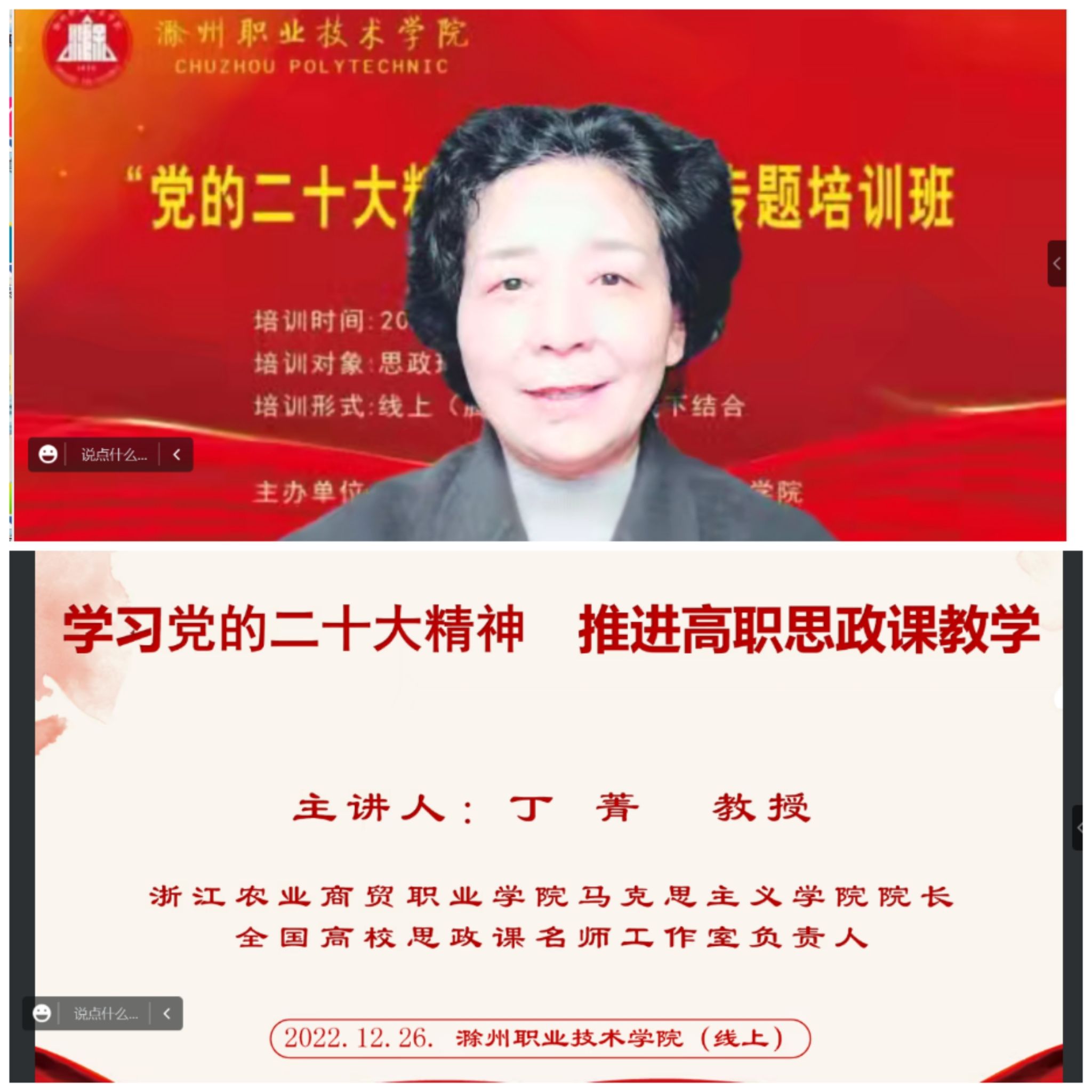 Beat365唯一官方网站习近平新时代中国特色社会主义思想和党的二十大精神进教材专题培训班正在如火如荼的进行中,12月26日,浙江农业商贸职业学院马克思主义学院院长、教授丁菁受邀做第二场专题辅导《学习党的二十大精神,推进高职思政课教学》,线上会议由马克思主义学院副院长孔金主持,全体专兼职思政教师参加。