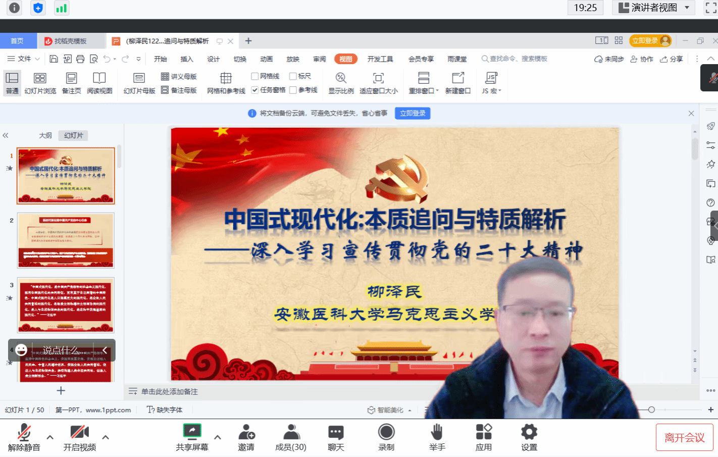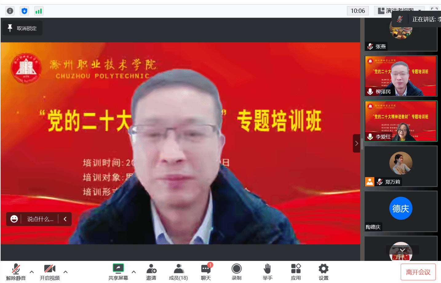 Beat365唯一官方网站习近平新时代中国特色社会主义思想和党的二十大精神进教材专题培训正在火热开展中,12月28日,安徽医科大学马克思主义学院院长、教授柳泽民受邀做第四场专题辅导《中国式现代化:本质追问与特质解析》,线上会议由马克思主义学院院长李爱红主持,全体专兼职思政教师参加。