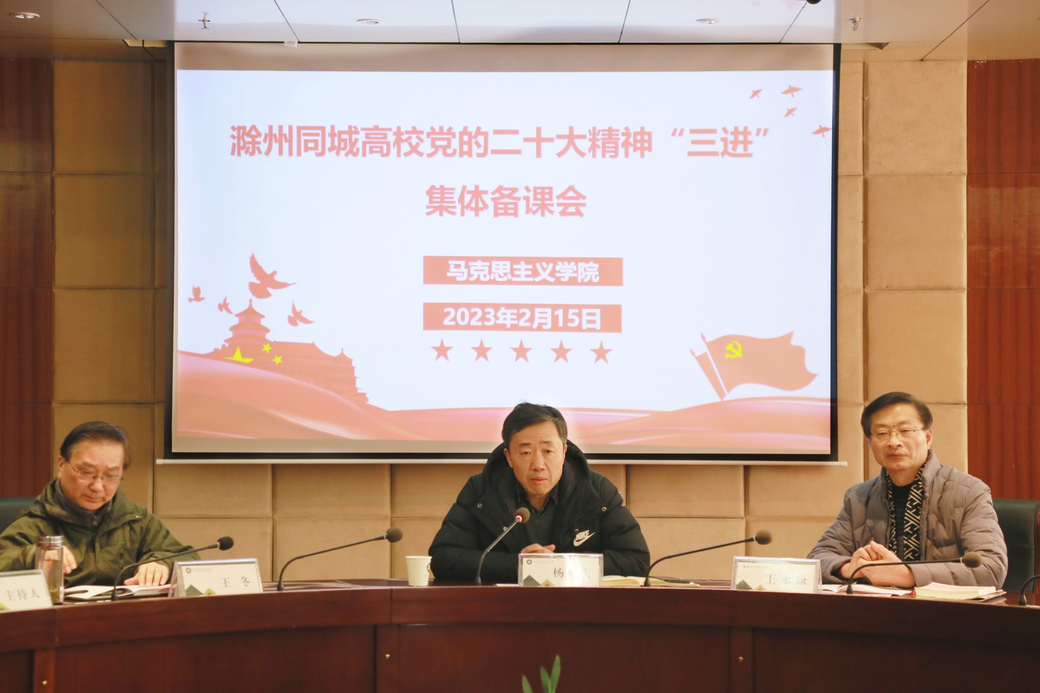为了帮助思政课教师加深对党的二十大精神的理解和把握,进一步推进将党的二十大精神融入思政课程,2月15日,马克思主义学院牵头组织滁州同城高校党的二十大精神“三进”集体备课会,主题为“中国式现代化理论与实践融入高校思想政治理论课教学”。备课会邀请到滁州市委党校副校长王永康与会梳理点评,滁州学院马克思主义学院党总支副书记、副院长张静、滁州城市职业学院马克思主义学院党总支书记、院长季金年带队参加备课会。Beat365党委副书记杨家庆、党委委员、基础部主任王冬出席会议并讲话。会议由马克思主义学院副院长孔金主持,地点在综合楼1102会议室,同城高校80余名思政课教师与会。