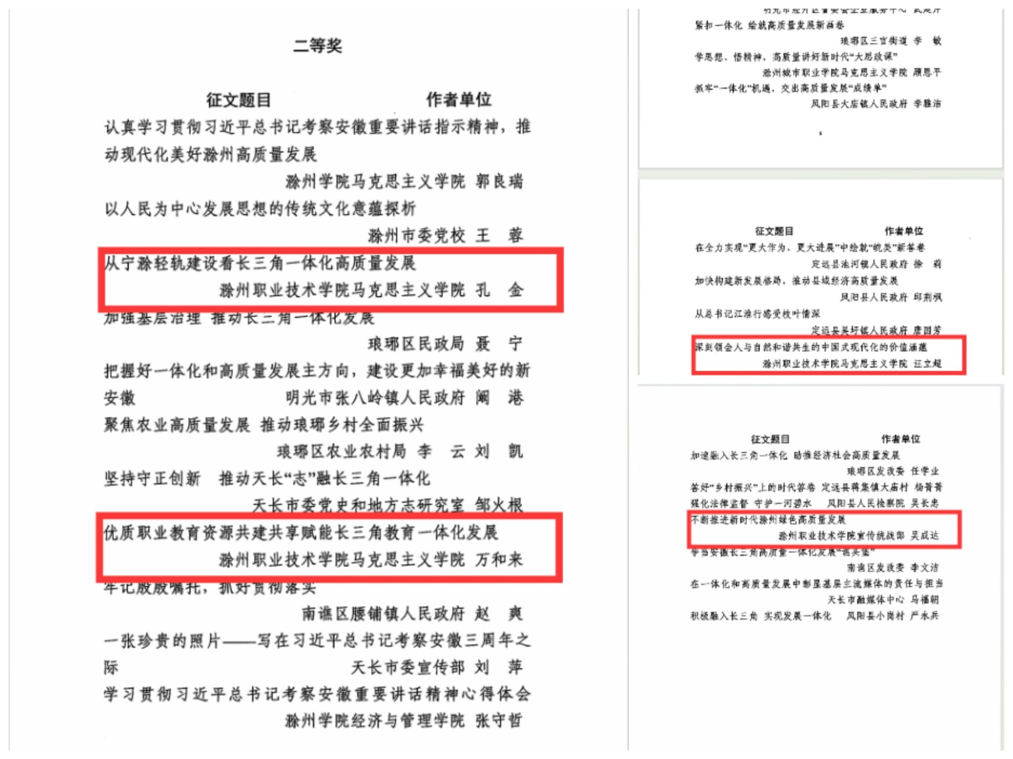 自活动开展以来,马克思主义学院积极响应校宣传统战部号召,广泛动员、精心组织,鼓励教师围绕征文主题积极创作,遴选出优秀作品推荐参加全市评比。获奖征文是《从宁滁轻轨建设看长三角一体化高质量发展》《优质职业教育资源共建共享赋能长三角教育一体化发展》《深刻领会人与自然和谐共生的中国式现代化的价值底蕴》和《不断推进新时代滁州绿色高质量发展》四篇,获奖作者分别是孔金、万和来、汪立超、吴成达四位老师。通过征文活动的开展,旨在认真贯彻落实习近平总书记关于推动长三角一体化发展重要讲话重要指示精神,树牢开展“思想大解放、环境大优化、能力大提升、作风大转变、任务大落实”大学习、大讨论、大调研,做到“六破六立”,对标江沪浙,扬滁所长、借船出海,奋力在高质量发展上展现更大作为。