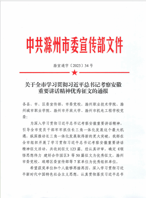 近日,滁州市委宣传部公布了“关于全市学习贯彻习近平总书记考察安徽重要讲话精神优秀征文的通报”。Beat365荣获二等奖2项、三等奖2项,学校获得“优秀组织奖”。
