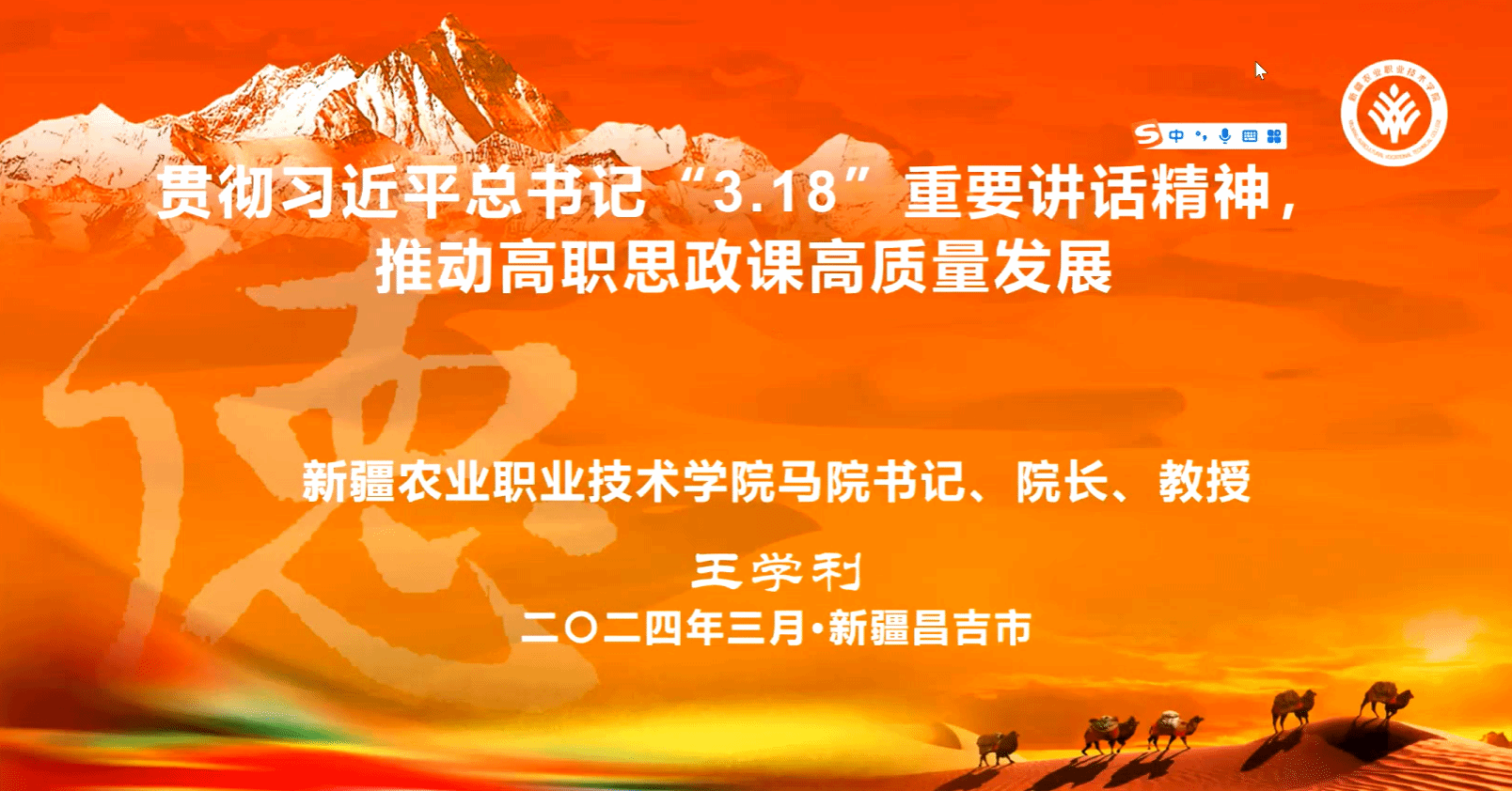 为更好地贯彻落实习近平总书记关于思政课建设的重要讲话精神,推进思政课建设改革创新,在学习贯彻落实“3·18”重要讲话精神五周年之际,3月11日,Beat365马克思主义学院邀请新疆农业职业技术学院马克思主义学院党总支书记、院长王学利在综合楼309会议室在线开展了题为“贯彻习近平总书记‘3·18’重要讲话精神,推动高职思政课高质量发展”的专题报告,继续推动“名师进校园”活动。本场讲座由马克思主义学院党总支书记、院长孔金主持,全体专兼职教师参加。