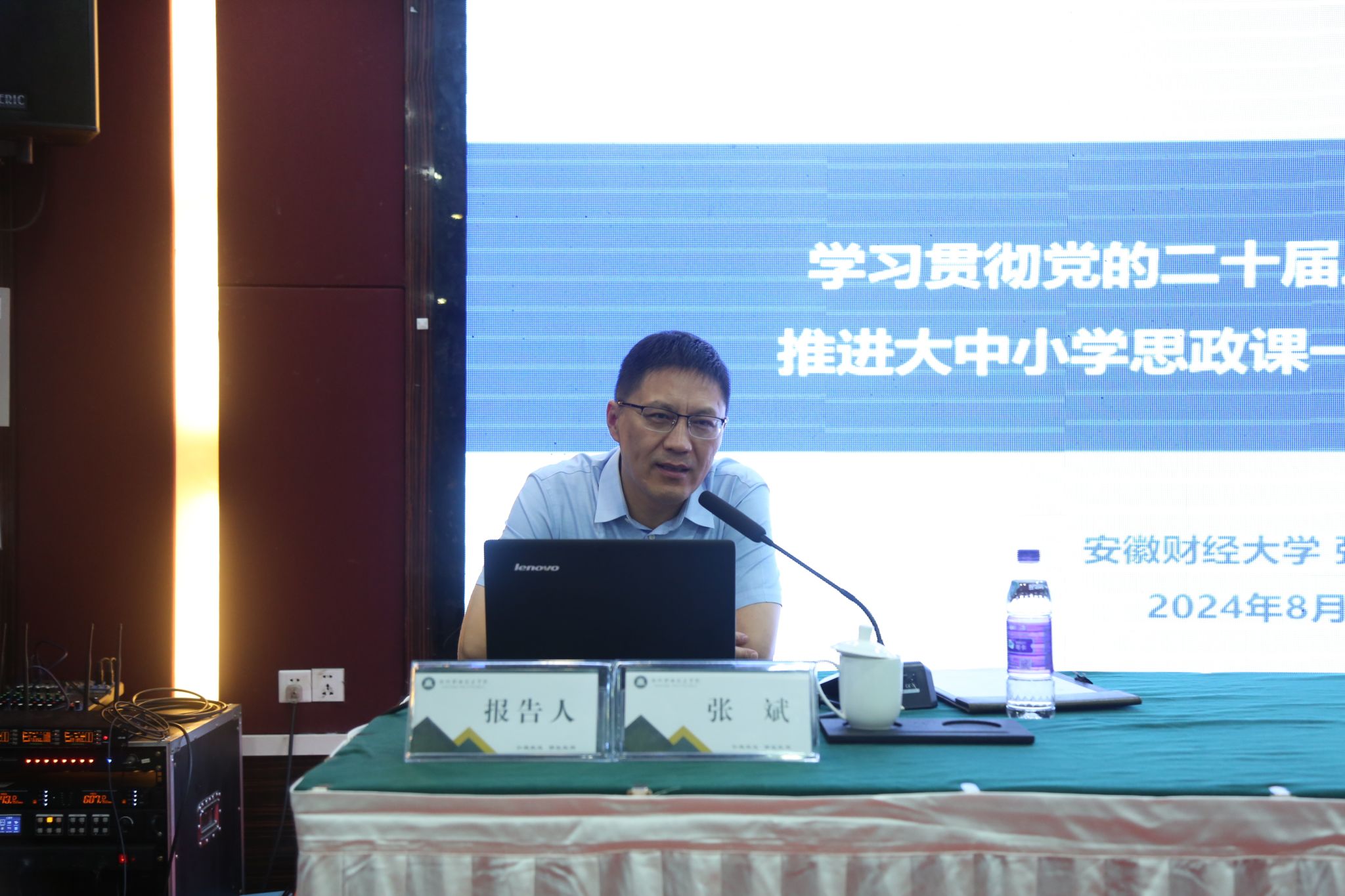 在专家报告中,安徽财经大学马克思主义学院院长张斌教授以《学习贯彻党的二十届三中全会精神 推进大中小思政课一体化改革创新》为题作专题报告。他从大中小思政课一体化到思政课教育一体化、当前思政课一体化建设存在的若干问题以及推动思政课一体化建设的安财探索与实践三个方面展开,阐述了当前大中小思政课一体化建设任重而道远,思政课教师要理直气壮讲好思政课,恰当定位自己的角色,明确思政课一体化建设的目标和任务,推动大中小学思政课一体化建设改革创新,从而为校际之间、教师之间、学生之间的交流互动创造更多平台和机会。