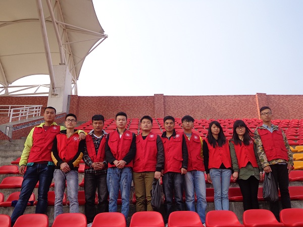 2014年11月12日中午,汽车系的青年志愿者们为第十一届运动会开幕式圆满召开清扫看台,给观众们提供一个良好的观看环境,他们带着清扫工具认真的打扫椅子上的污渍,清除看台上的垃圾,为操场留下一道漂亮的弧线。同时预祝汽车系的运动健儿们能够获得佳绩。
