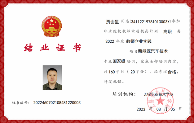 为了提升专业课教师的教学能力,2023年7月9日至7月31日,机械与汽车工程学院贾会星老师赴无锡参加了无锡职业技术学院承办的2022年安徽省高职教师素质提高计划国家级培训项目教师企业实践(新能源汽车运用与维护)培训班的培训学习。