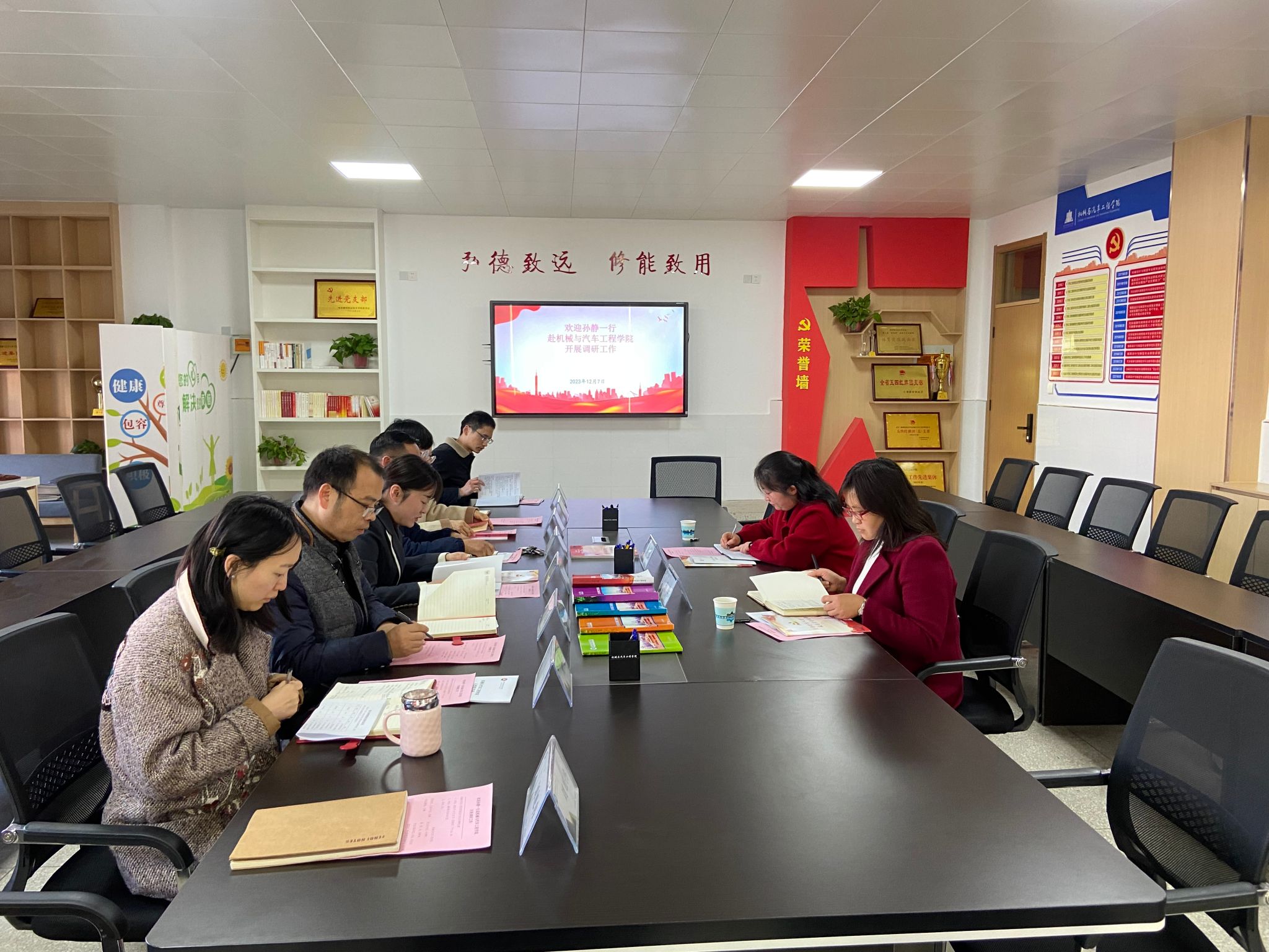 孙静实地查看机汽学院党建阵地、走廊文化墙、汽车工程系党支部活动室后前往会议室开展座谈。会上,朱婷婷从机械与汽车工程学院的岗位编配、职称情况、党组织设立等方面进行汇报,杨章林就专业群建设、学生培养、实习、就业、学生竞赛、校企合作、实验室建设等方面进行汇报,吴佳佳就主题教育的开展情况进行汇报。