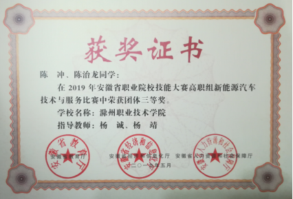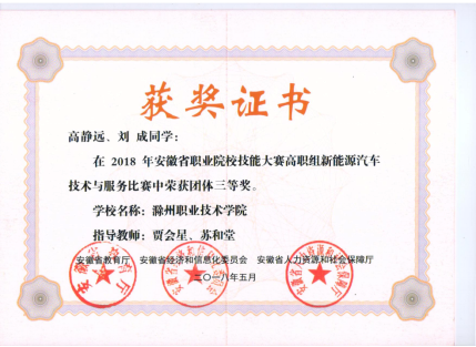 新能源汽车技术专业在成立以来一直坚持参加职业院校技能大赛,依靠技能大赛推动教学改革,依靠技能大赛促进校企合作,依靠技能大赛选拔优秀学生,树立学生榜样,形成崇尚技能,推崇工匠精神的良好氛围。在2018年,2019年安徽省职业院校技能大赛新能源汽车服务项目赛项中均获得良好成绩。