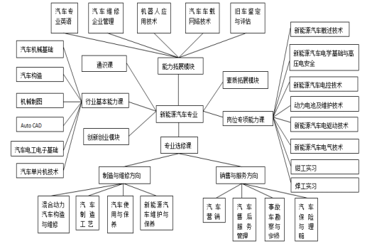 课程体系的建立主要依据培养拥护党的基本路线、方针和政策,掌握新能源汽车的机电传动、电池充放电技术、控制系统的原理和维修能力,能熟练进行新能源汽车的维修工艺制定,具有新能源汽车技术专业必备的技术技能人才。在课程体系的架构上主要包含国家规定必须学习的通识课,为了完成本专业课程学习的专业基础课,本专业人才必须掌握的基本内容的岗位专项能力课,以及为了拓宽学生的就业面,拓展学生的知识体系的专业选修课等部分组成。通过校内外教师,企业等共同制定本课程体系,培养符合社会需要的新能源汽车专业人才。