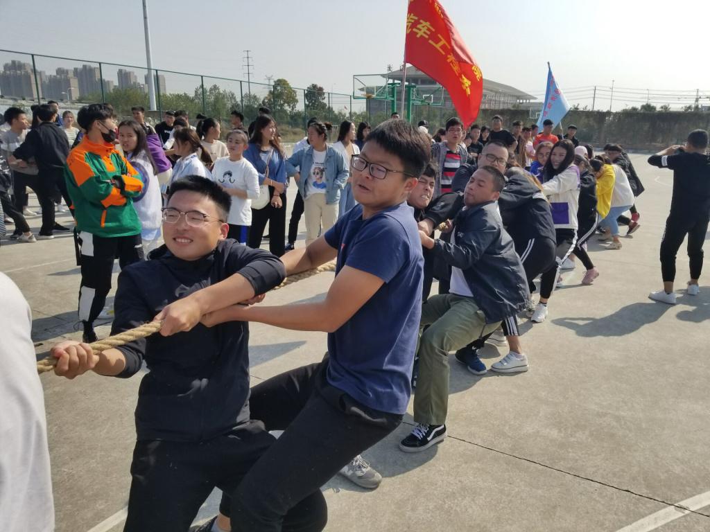 比赛开的哨声还没有响起,队员们已紧紧的抓住绳子,虎视眈眈的盯着红线,蓄势待发。当哨声响起,只见每位参赛人员都紧握长绳,卯足了劲往后拉,绳子中间的红线左右摇摆,刺激着队员们使出更大的力气,旁边啦啦队在场边加油助威。比赛过程呐喊声、哨子声此起彼伏,激烈的比赛把气氛推到了最高潮。最终汽车系的小伙伴们经过“血战拼搏”争夺到拔河比赛第三名好成绩。