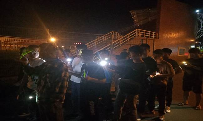 晚上8时,同学们准时来到了操场,在现场发放完荧光棒等物品后,开始跑动起来,他们头戴荧光饰品,手握荧光棒,把整个操场装点成一个荧光闪耀的欢乐海洋,涌动的人群在跑道上形成了一道道亮丽的风景线。