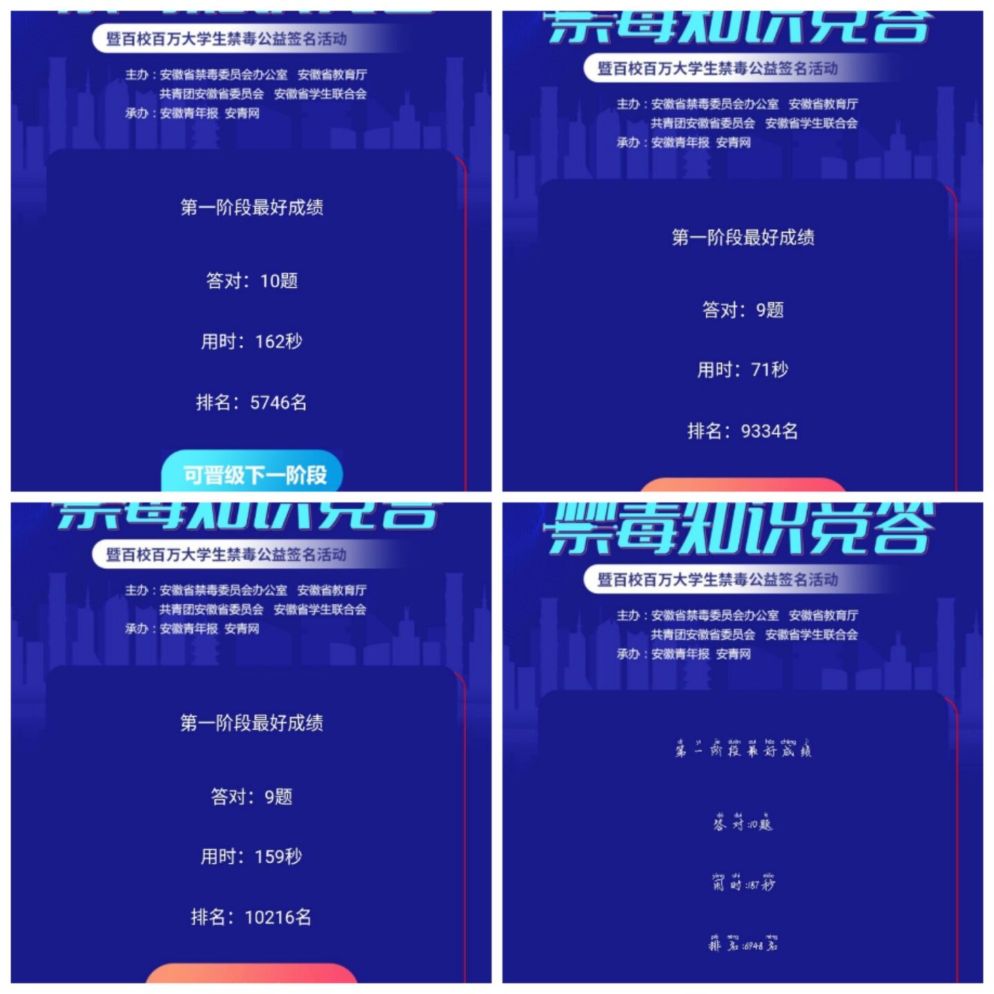 活动中,同学们利用手机关注“安徽禁毒”公众号,浏览毒品教育内容之后,积极参加线上答题活动,合格率达到了90%,不少学生还取得了满分的优异成绩。