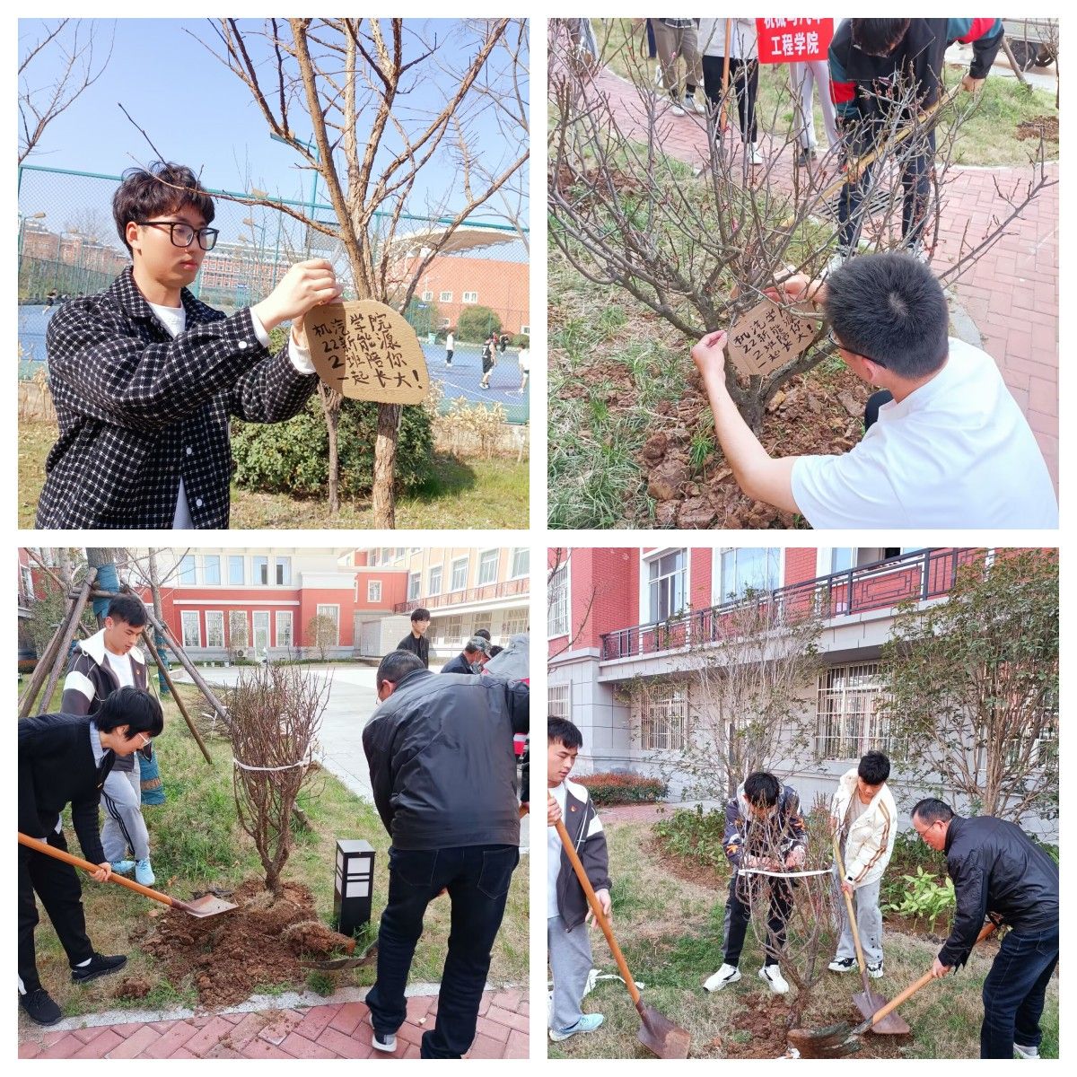 活动开始,同学们兵分两组,一组同学种植红梅、茶花,另一组种琅琊榆。活动现场十分有序,有挖土坑的,有扶树苗的,有填土的,还有提着水桶来回浇水的。参加活动的每一位同学都展现出了他们对绿意的热爱,大家互帮互助,欢乐的笑声回荡在校园中。随着手里的土锹铲土踩土,一颗颗小树栽进校园里肥沃的土地,看着自己亲手种下的一颗颗小树,同学们即兴奋又感动,挂上树牌,期待着小树的成长!