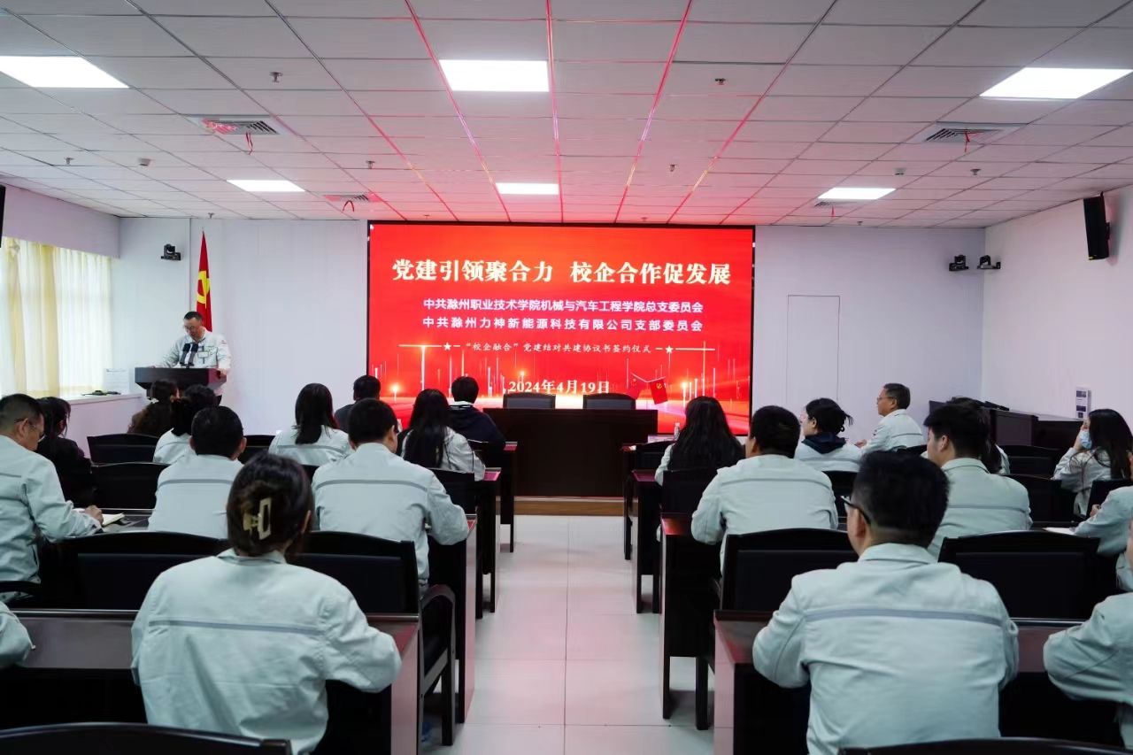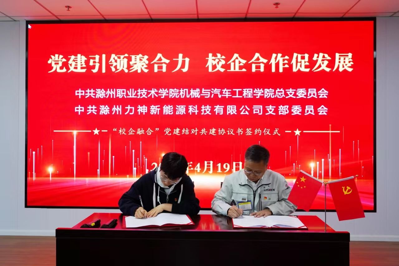 4月19日下午,Beat365唯一官方网站机械与汽车工程学院党总支与滁州力神新能源科技有限公司党支部举行“校企融合”党建结对共建签约,以党建为引领深化校企合作,推动实现党建与校企发展同频共振、互促共赢。Beat365唯一官方网站机汽学院党总支副书记吴佳佳,副书记刘杰,副院长杨章林,马克思主义学院党总支副书记陈琴,滁州力神党支部组织委员、副总经理王哲,宣传委员、设备工艺部部长柳兴森出席签约仪式。