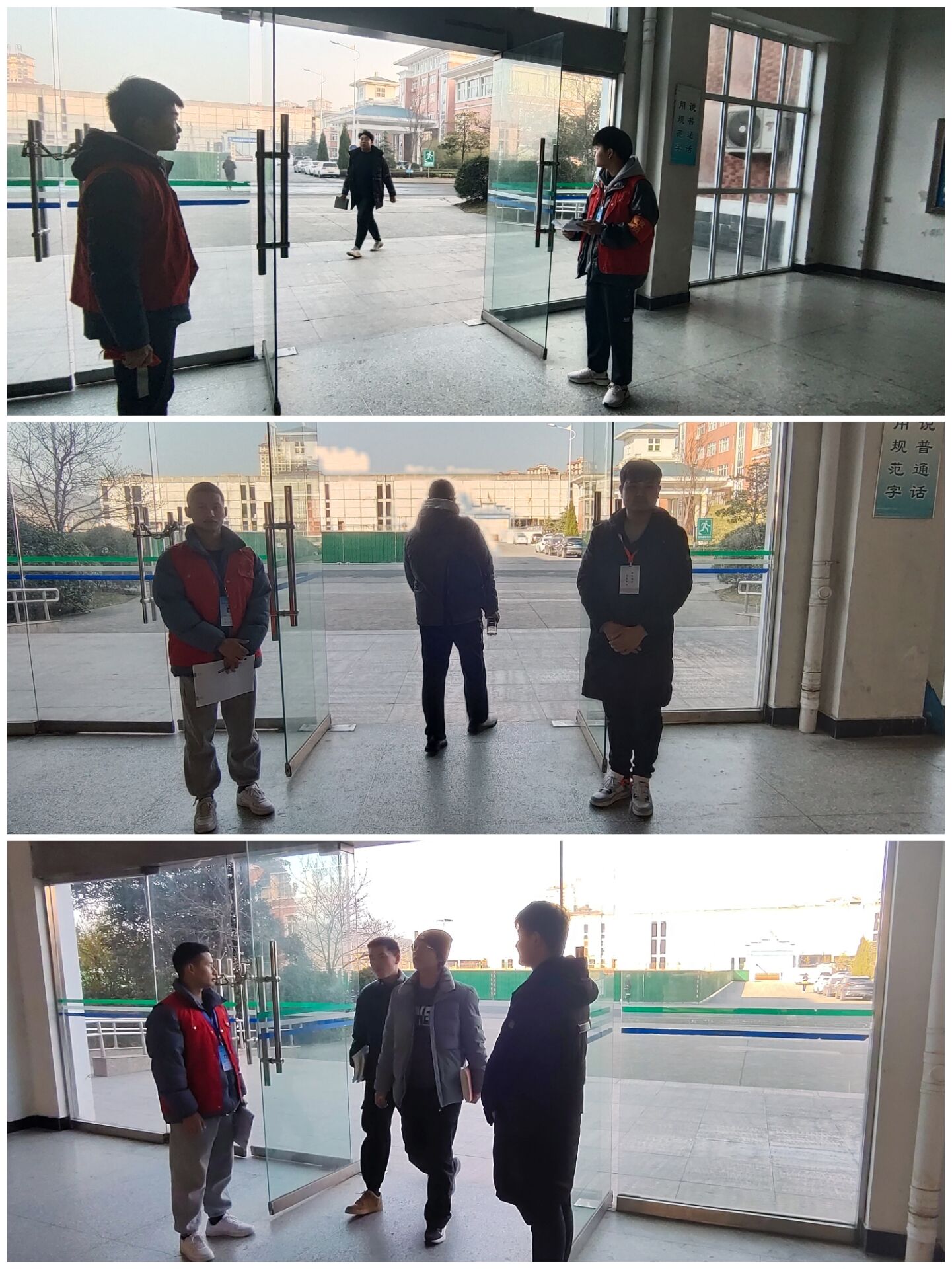 早上740文明督导员按照要求监督、劝导学生不带早餐进教学楼,并按规定停放自行车。天气虽然寒冷,但为了校园文明更好发展,大家不惧严寒,坚守在自己的岗位上。督导员与老师们在执勤纠违过程中,见到发生不文明行为的同学,便走上前去,微笑着耐心的劝导同学,同时认真做好执勤记录,身着红色工作服的他们俨然成为了冬日校园中一道亮丽的风景线。