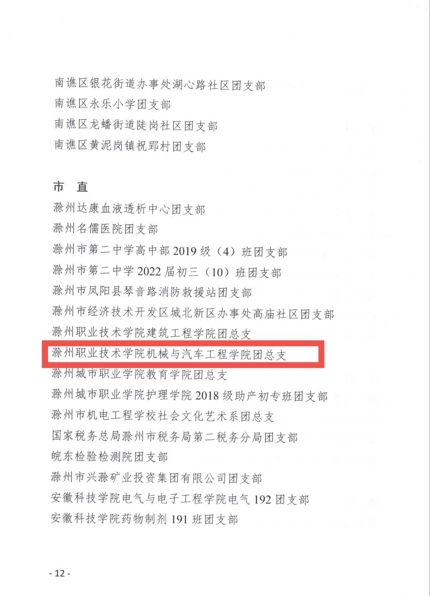 滁州市五四红旗团()支部是共青团滁州市委授予全市基层团组织的最高荣誉。近年来,机械与汽车工程学院团总支在校团委和院党总支的正确领导下,紧密围绕学校、学院工作实际,认真贯彻落实各项工作部署,充分发挥团组织凝聚青年团员力量的先进政治作用,扎实推进我院广大团员青年的思想建设,引领广大团员青年健康成长成才,推动学院团学工作实现新的发展。