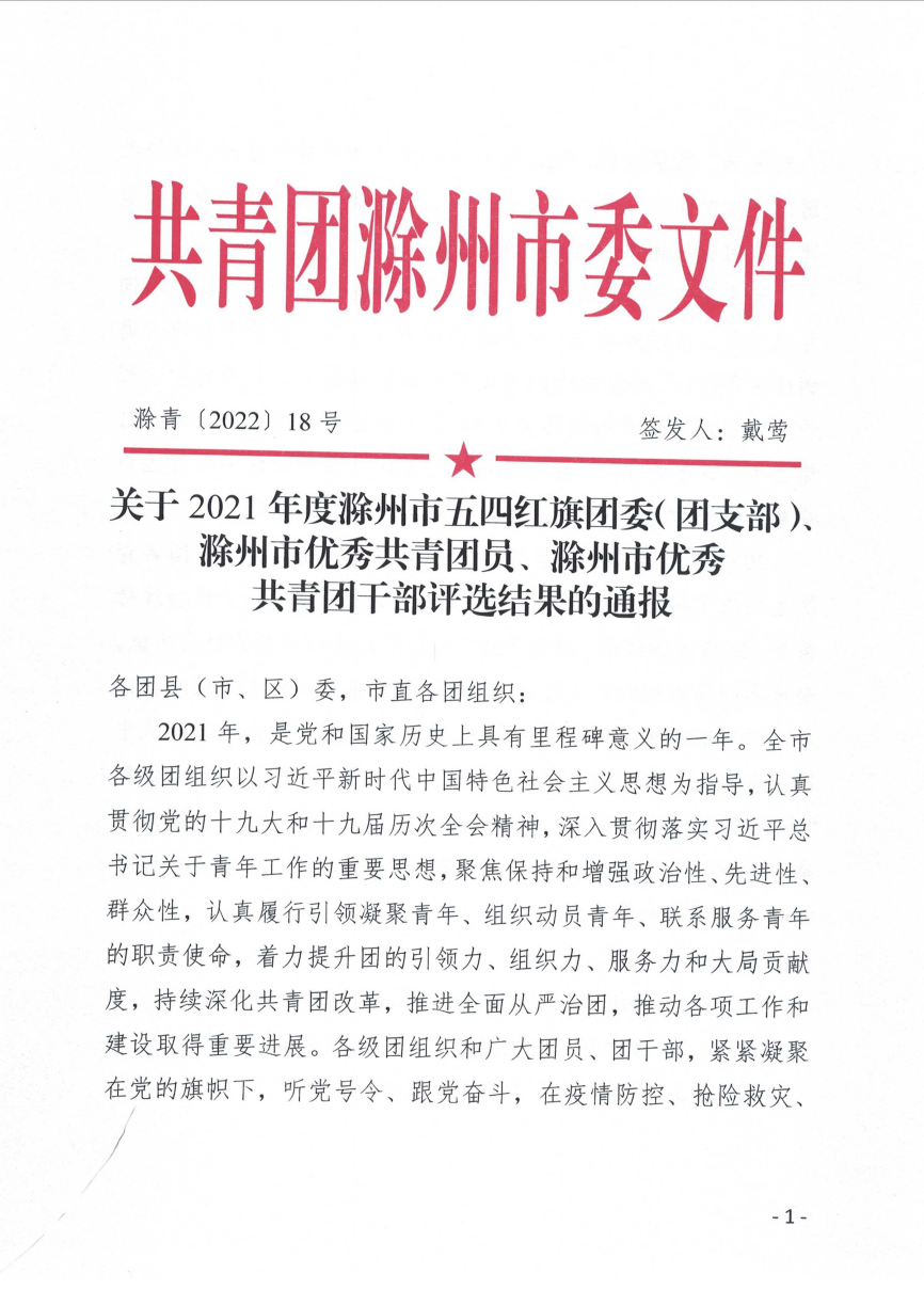 近日,团市委发布《关于2021年度滁州市五四红旗团委(团支部) 滁州市优秀共青团员、滁州市优秀共青团干部评选结果的通报》,我院团总支荣获“滁州市五四红旗团()支部”荣誉称号。