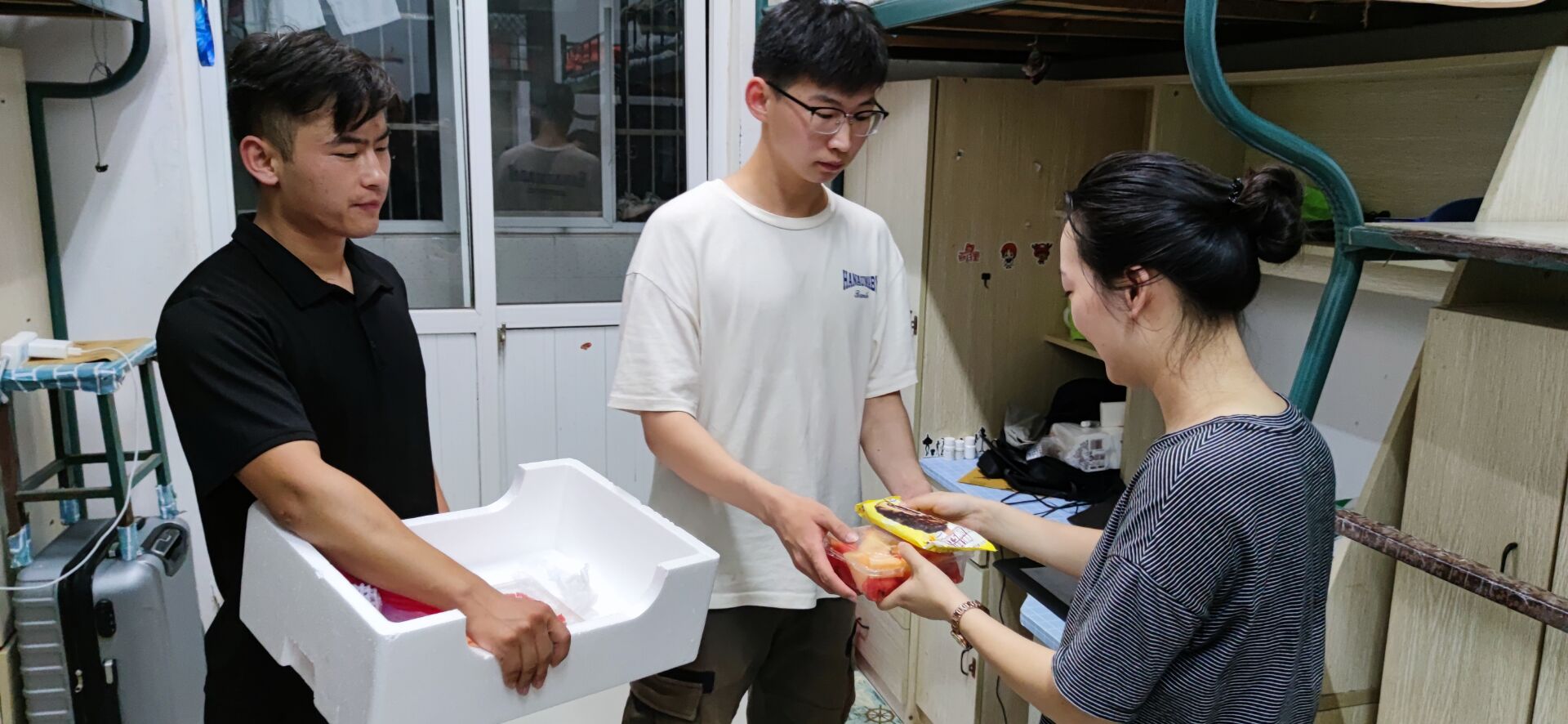 倪子旭老师领队朱宾同学挨个走进了志愿者们的宿舍,为志愿者们送上新鲜的水果以及解暑的雪糕,并嘱咐他们夏日炎炎,在完成省十五运志愿工作的同时,要注意休息,严防中暑,身体健康是永远排第一位的。通过与志愿者们的亲切交流,详细了解了他们在志愿服务工作和生活情况,对志愿者们无私奉献的精神表示赞赏。