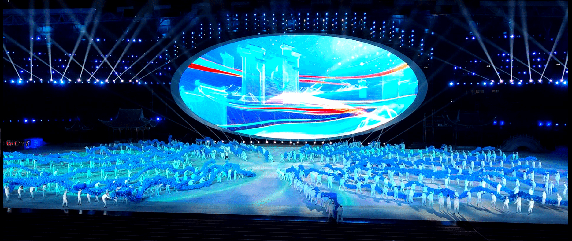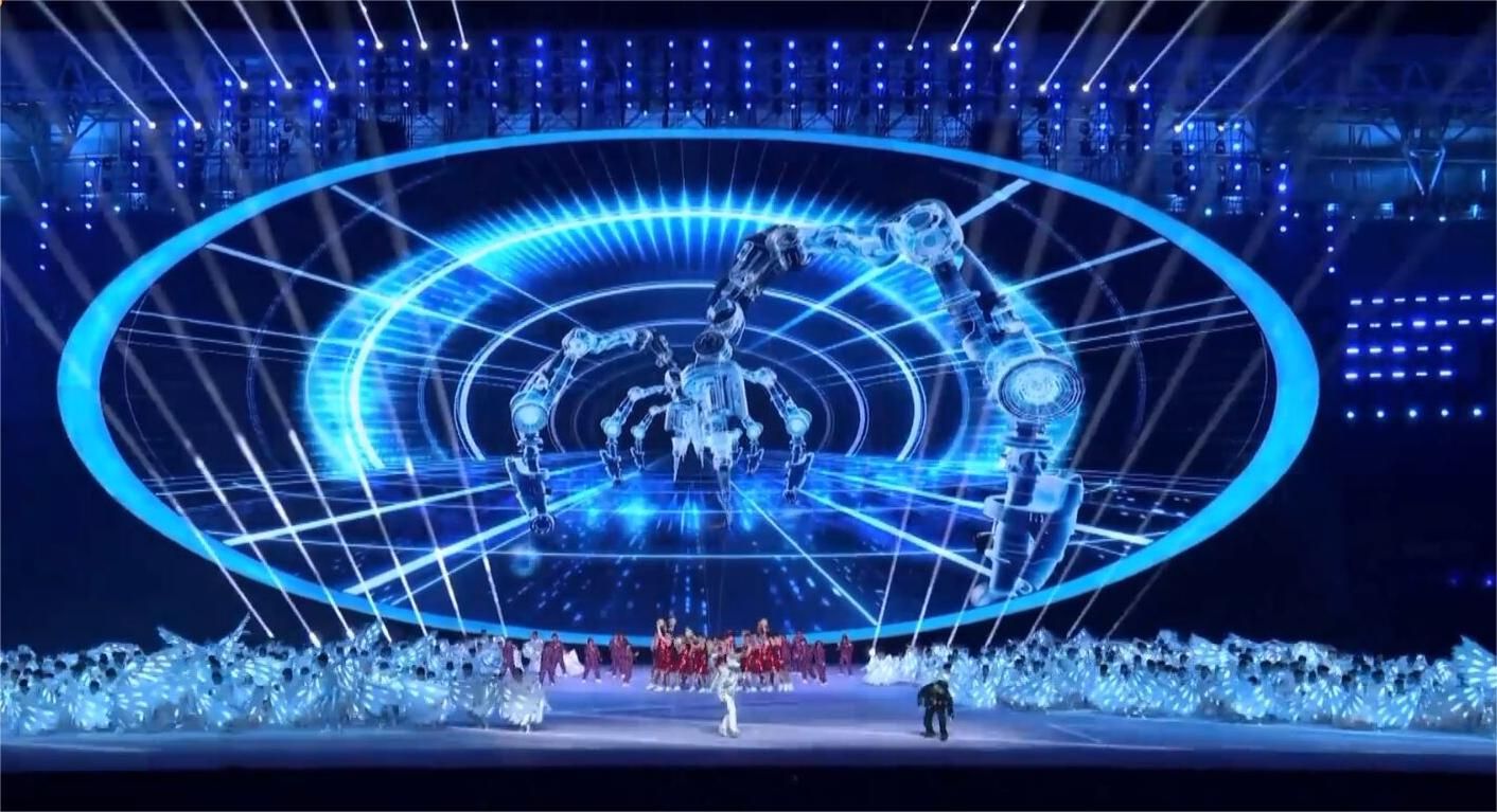 开幕式中,参加《超越•向未来》的同学高举蓝色气球龙组合铺展成长江与淮河的形状,宛如两条驭风的巨龙光影流动,一棵硕大的迎客松张开怀抱欢迎五方来宾;《逐梦之光》的律动表演与激情音乐惊艳全场,同学们挥舞着翅膀追逐科技之光。