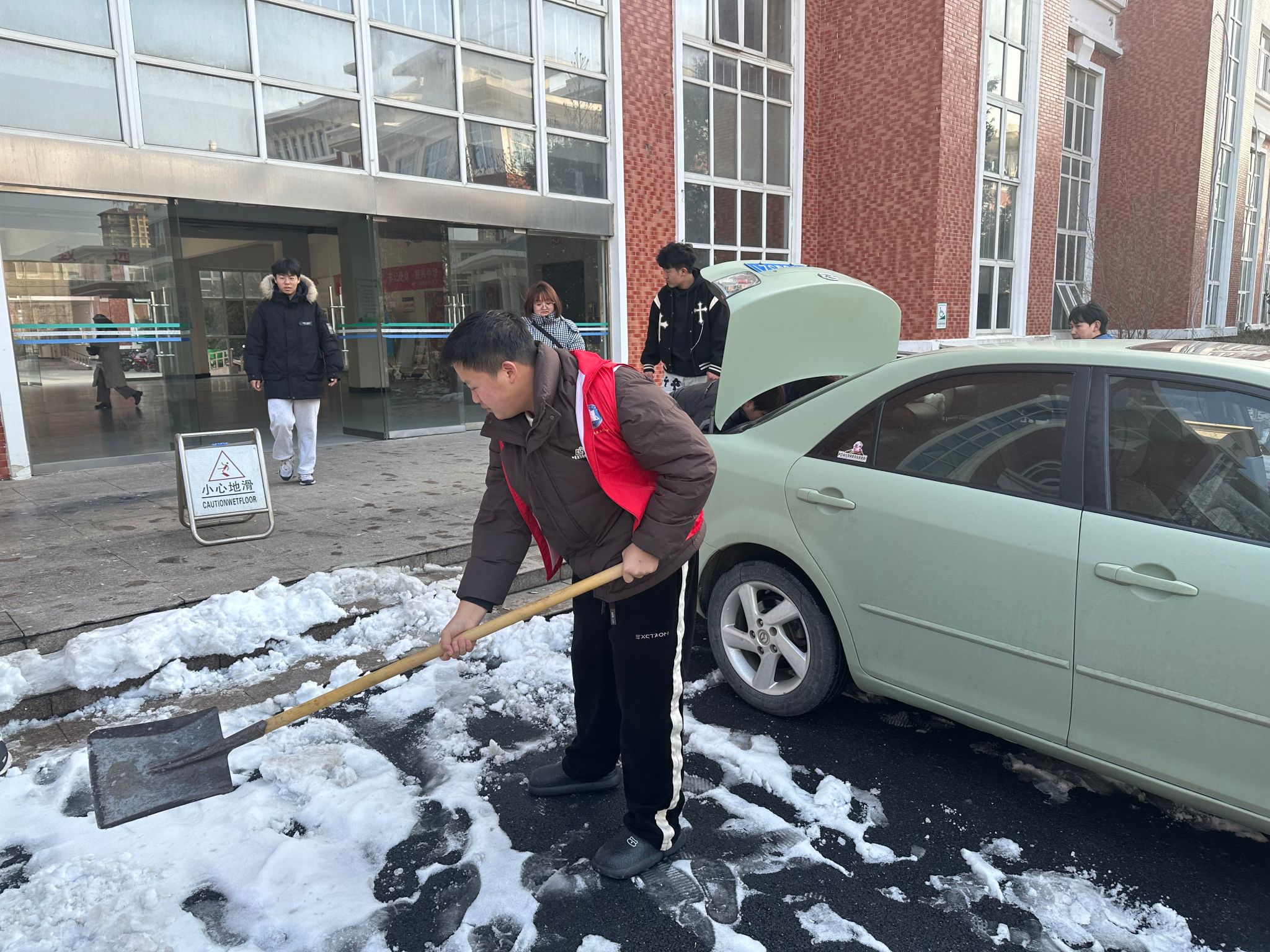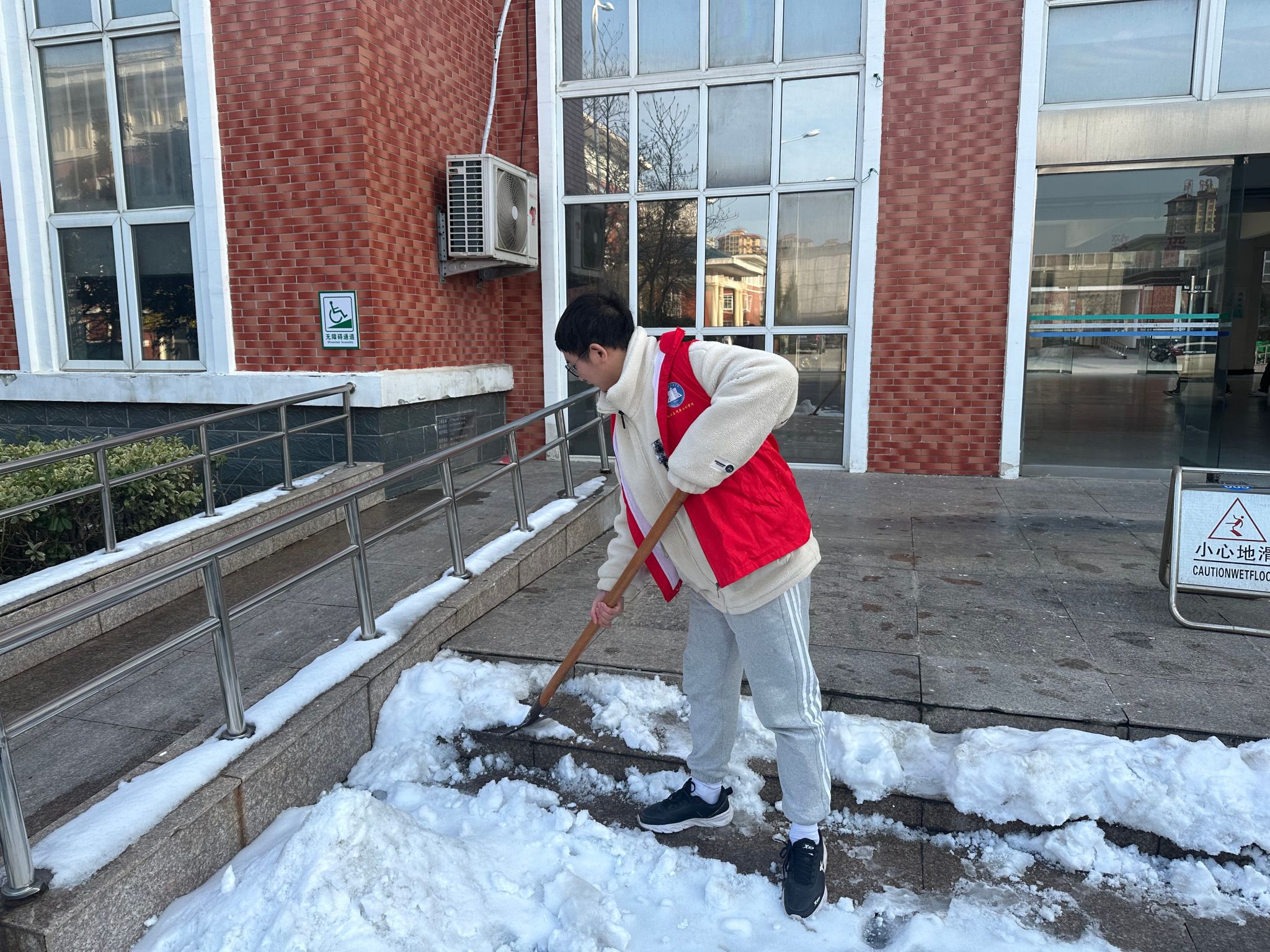降雪天气给教学楼前带来了积雪,给学生上课带来了不便和安全隐患。为了解决这一问题,益暖服务队组织积雪清扫志愿活动,全员参与积极投入清扫积雪的工作。