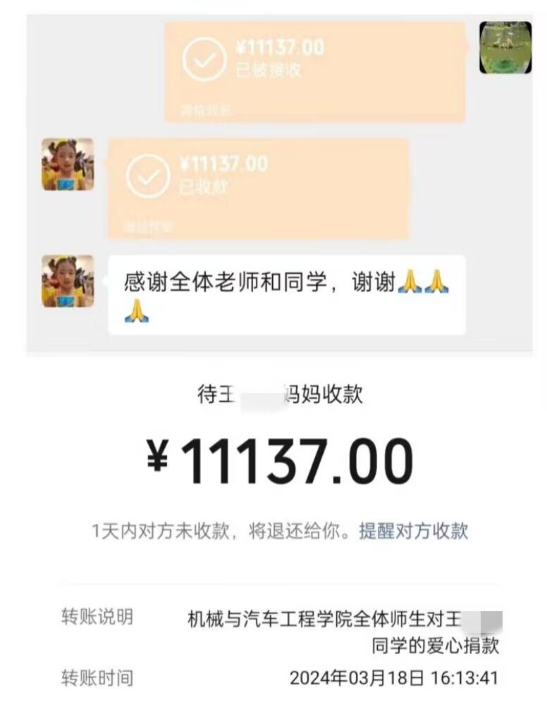 献出一份爱心,托起一份希望。机械与汽车工程学院红十字分会完成了对机汽学院23级王同学的爱心捐款,共计11137元。